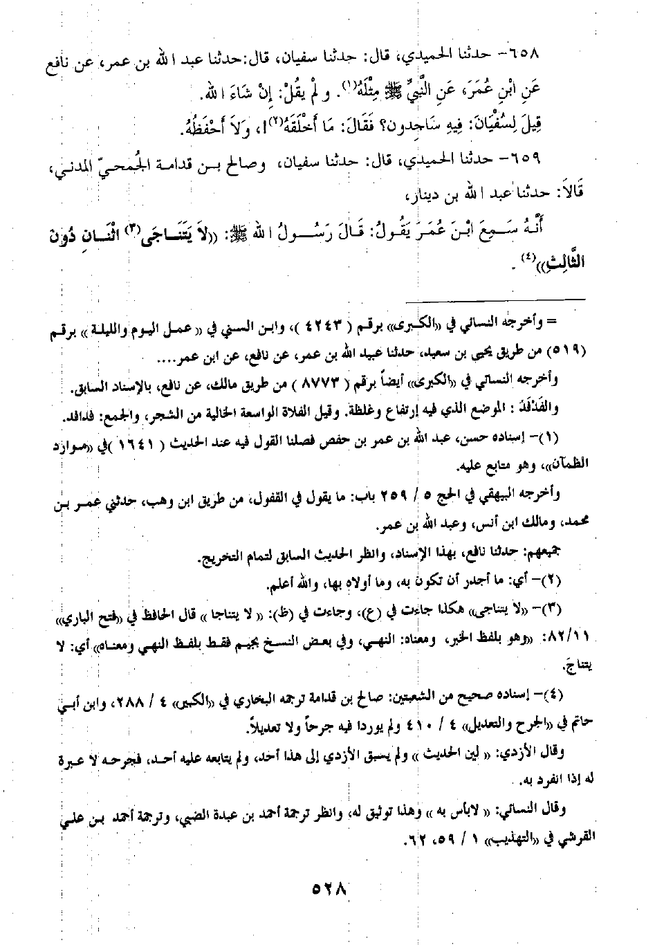 659 - حَدَّثَنَا الْحُمَيْدِيُّ قَالَ: ثنا سُفْيَانُ، وَصَالِحُ بْنُ قُدَامَةَ الْجُمَحِيُّ الْمَدَنِيُّ، قَالَا: ثنا عَبْدُ اللَّهِ بْنُ دِينَارٍ، أَنَّهُ سَمِعَ ابْنَ عُمَرَ، يَقُولُ: قَالَ رَسُولُ اللَّهِ صَلَّى اللهُ عَلَيْهِ وَسَلَّمَ: «§لَا يَتَنَاجَى اثْنَانِ دُونَ الثَّالِثِ»