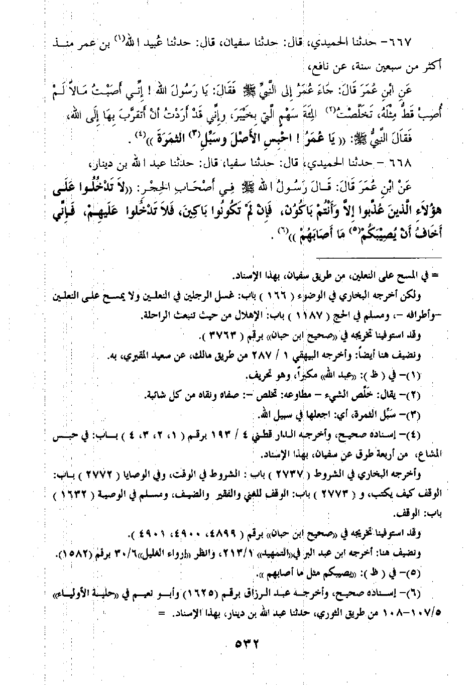 667 - حَدَّثَنَا الْحُمَيْدِيُّ قَالَ: ثنا سُفْيَانُ، قَالَ: ثنا عَبْدُ اللَّهِ بْنُ عُمَرَ مُنْذُ أَكْثَرَ مِنْ سَبْعِينَ سَنَةً، عَنْ نَافِعٍ، عَنِ ابْنِ عُمَرَ، قَالَ: جَاءَ عُمَرُ إِلَى النَّبِيِّ صَلَّى اللهُ عَلَيْهِ وَسَلَّمَ، فَقَالَ: يَا رَسُولَ اللَّهِ إِنِّي أَصَبْتُ مَالًا لَمْ أُصِبْ قَطُّ مِثْلَهُ، تَخَلَّصْتُ الْمِائَةَ سَهْمٍ الَّتِي بِخَيْبَرَ، وَإِنِّي قَدْ أَرَدْتُ أَنْ أَتَقَرَّبَ بِهَا إِلَى اللَّهِ، فَقَالَ النَّبِيُّ صَلَّى اللهُ عَلَيْهِ وَسَلَّمَ: «§يَا عُمَرُ، احْبِسِ الْأَصْلَ، وَسَبِّلِ الثَّمَرَةَ»