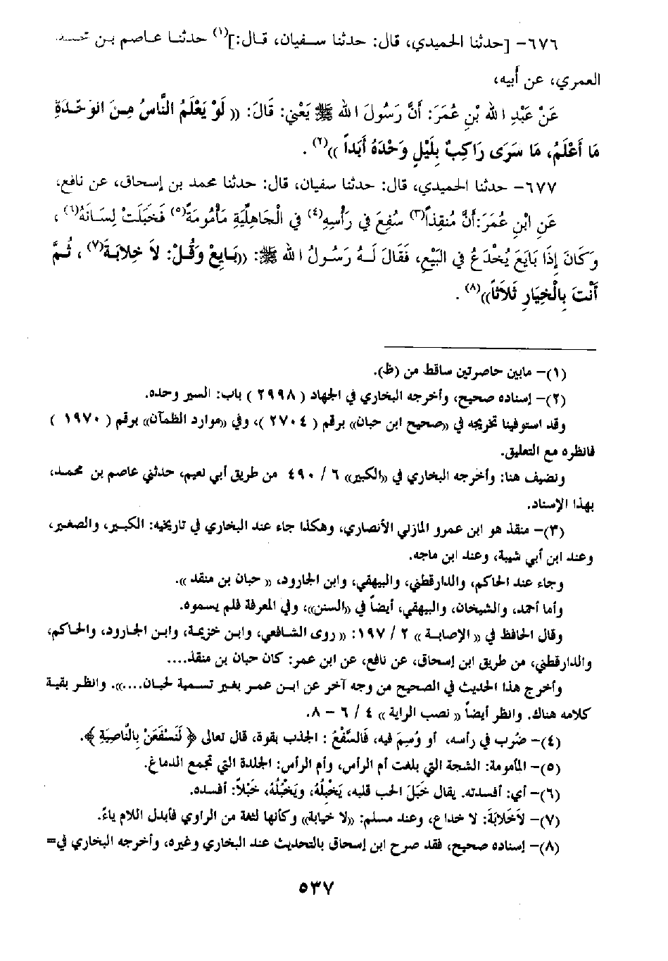 677 - حَدَّثَنَا الْحُمَيْدِيُّ قَالَ: ثنا سُفْيَانُ، قَالَ: ثنا مُحَمَّدُ بْنُ إِسْحَاقَ، عَنْ نَافِعٍ، عَنِ ابْنِ عُمَرَ، أَنَّ مُنْقِذًا سُفِعَ فِي رَأْسِهِ فِي الْجَاهِلِيَّةِ مَأْمُومَةً، فَخَبَلَتْ لِسَانَهُ، وَكَانَ إِذَا بَايَعَ يُخْدَعُ فِي الْبَيْعِ، فَقَالَ لَهُ رَسُولُ اللَّهِ صَلَّى اللهُ عَلَيْهِ وَسَلَّمَ: " §بَايِعْ وَقُلْ: لَا خِلَابَةَ، ثُمَّ أَنْتَ بِالْخِيَارِ ثَلَاثًا " -[538]-، قَالَ ابْنُ عُمَرَ: فَسَمِعْتُهُ يُبَايِعُ، وَيَقُولُ: لَا خِذَابَةَ
