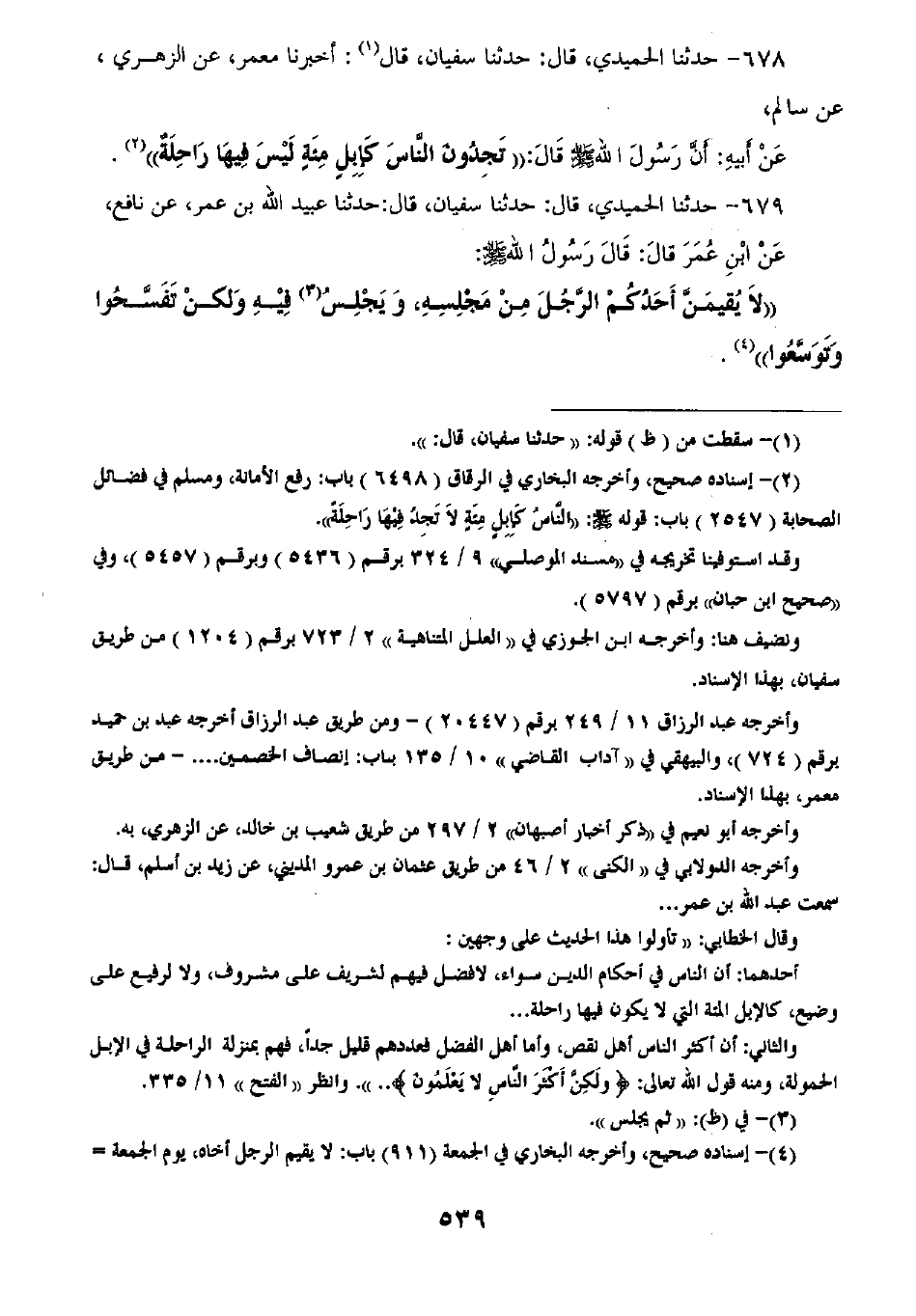 678 - حَدَّثَنَا الْحُمَيْدِيُّ قَالَ: ثنا سُفْيَانُ، قَالَ: أَخْبَرَنَا مَعْمَرٌ، عَنِ الزُّهْرِيِّ، عَنْ سَالِمٍ، عَنْ أَبِيهِ، أَنَّ رَسُولَ اللَّهِ صَلَّى اللهُ عَلَيْهِ وَسَلَّمَ، قَالَ: «§تَجِدُونَ النَّاسَ كَإِبِلٍ مِائَةٍ لَيْسَ فِيهَا رَاحِلَةٌ»