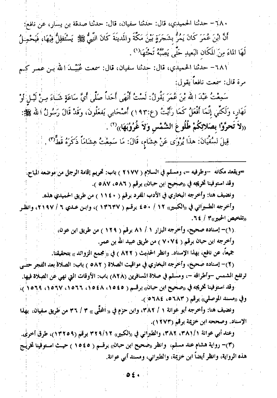 681 - حَدَّثَنَا الْحُمَيْدِيُّ قَالَ: ثنا سُفْيَانُ، قَالَ: سَمِعْتُ عَبْدَ اللَّهِ بْنَ عُمَرَ كَمْ مَرَّةٍ، قَالَ: سَمِعْتُ نَافِعًا، يَقُولُ: سَمِعْتُ عَبْدَ اللَّهِ بْنَ عُمَرَ، يَقُولُ: لَسْتُ أَنْهَى أَحَدًا صَلَّى أَيَّ سَاعَةٍ شَاءَ مِنْ لَيْلٍ أَوْ نَهَارٍ، وَلَكِنِّي إِنَّمَا أَفْعَلُ كَمَا رَأَيْتُ أَصْحَابِي يَفْعَلُونَ، وَقَدْ قَالَ رَسُولُ اللَّهِ صَلَّى اللهُ عَلَيْهِ وَسَلَّمَ: «§لَا تَحَرَّوْا بِصَلَاتِكُمْ طُلُوعَ الشَّمْسِ، وَلَا غُرُوبَهَا» ، قِيلَ لِسُفْيَانَ: هَذَا يُرْوَى عَنْ هِشَامٍ، قَالَ: «مَا سَمِعْتُ هِشَامًا ذَكَرَهُ قَطُّ»