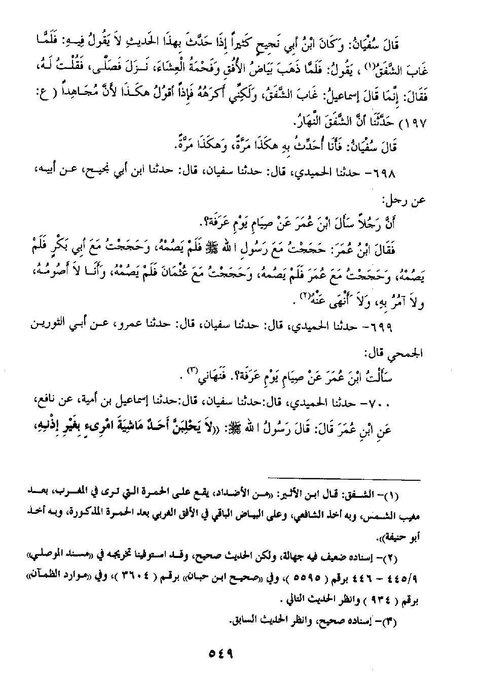 698 - حَدَّثَنَا الْحُمَيْدِيُّ قَالَ: ثنا ابْنُ أَبِي نَجِيحٍ، عَنْ أَبِيهِ، عَنْ رَجُلٍ، أَنَّ رَجُلًا سَأَلَ ابْنَ عُمَرَ §عَنْ صِيَامِ يَوْمِ عَرَفَةَ، فَقَالَ ابْنُ عُمَرَ: «حَجَجْتُ مَعَ رَسُولِ اللَّهِ صَلَّى اللهُ عَلَيْهِ وَسَلَّمَ فَلَمْ يَصُمْهُ، وَحَجَجْتُ مَعْ أَبِي بَكْرٍ فَلَمْ يَصُمْهُ، وَحَجَجْتُ مَعَ عُمَرَ فَلَمْ يَصُمْهُ، وَحَجَجْتُ مَعَ عُثْمَانَ فَلَمْ يَصُمْهُ، وَأَنَا لَا أَصُومُهُ وَلَا آمُرُ بِهِ وَلَا أَنْهَى عَنْهُ»