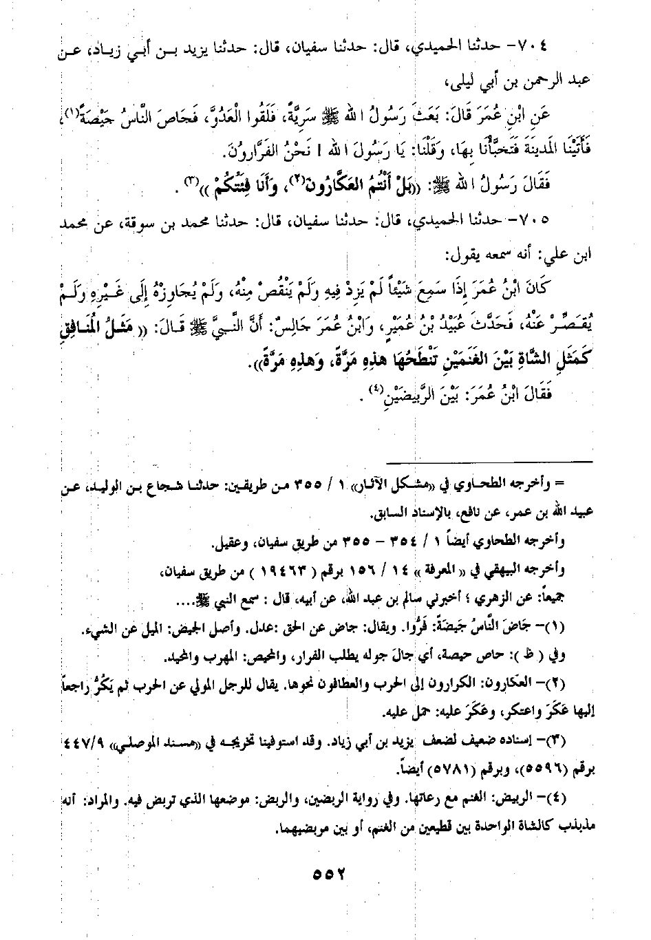 704 - حَدَّثَنَا الْحُمَيْدِيُّ قَالَ: ثنا سُفْيَانُ، قَالَ: ثنا يَزِيدُ بْنُ أَبِي زِيَادٍ، عَنْ عَبْدِ الرَّحْمَنِ بْنِ أَبِي لَيْلَى، عَنِ ابْنِ عُمَرَ، قَالَ: بَعَثَ رَسُولُ اللَّهِ صَلَّى اللهُ عَلَيْهِ وَسَلَّمَ سَرِيَّةً فَلَقُوا الْعَدُوَّ، فَحَاصَ النَّاسُ حَيْصَةً، فَأَتَيْنَا الْمَدِينَةَ، فَتَخَبَّأْنَا بِهَا، وَقُلْنَا: يَا رَسُولَ اللَّهِ، نَحْنُ الْفَرَّارُونَ، فَقَالَ رَسُولُ اللَّهِ صَلَّى اللهُ عَلَيْهِ وَسَلَّمَ: «بَلْ §أَنْتُمُ الْعَكَّارُونَ وَأنَا فِئَتُكُمْ»
