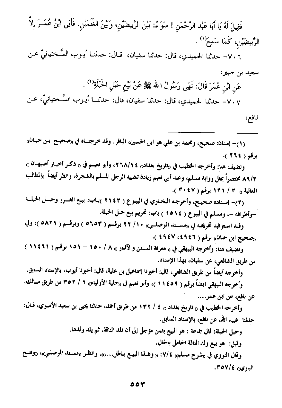 706 - حَدَّثَنَا الْحُمَيْدِيُّ قَالَ: ثنا سُفْيَانُ، قَالَ: حَدَّثَنَا أَيُّوبُ السِّخْتِيَانِيُّ، عَنْ سَعِيدِ بْنِ جُبَيْرٍ، عَنِ ابْنِ عُمَرَ، قَالَ: «§نَهَى رَسُولُ اللَّهِ صَلَّى اللهُ عَلَيْهِ وَسَلَّمَ عَنْ بَيْعِ حَبَلِ الْحُبْلَةِ»