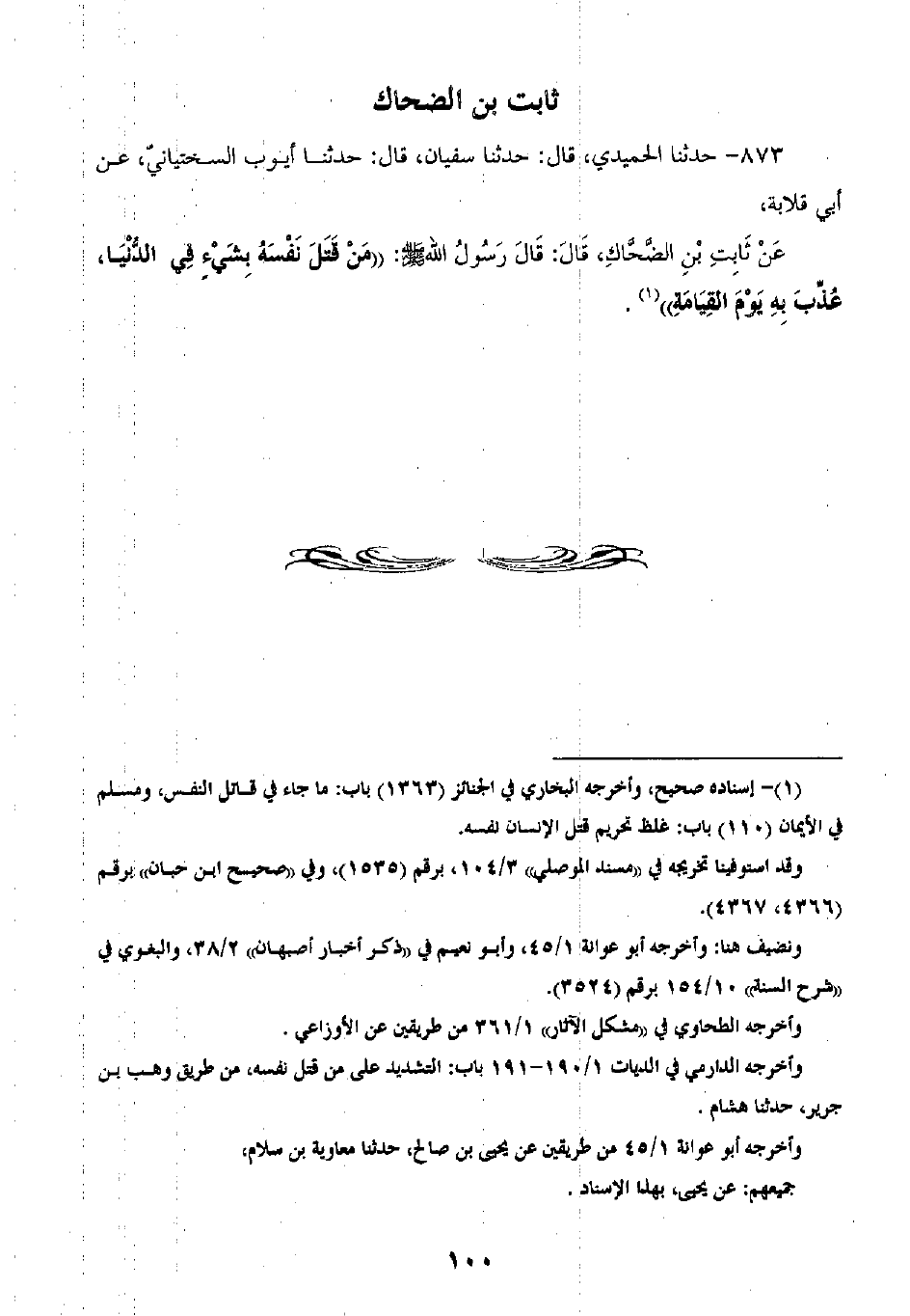 873 - حَدَّثَنَا الْحُمَيْدِيُّ قَالَ: ثنا سُفْيَانُ، قَالَ: ثنا أَيُّوبُ السِّخْتِيَانِيُّ، عَنْ أَبِي قِلَابَةَ، عَنْ ثَابِتِ بْنِ الضَّحَّاكِ، قَالَ: قَالَ رَسُولُ اللَّهِ صَلَّى اللهُ عَلَيْهِ وَسَلَّمَ: «§مَنْ قَتَلَ نَفْسَهُ بِشَيْءٍ فِي الدُّنْيَا عُذِّبَ بِهِ يَوْمَ الْقِيَامَةِ»