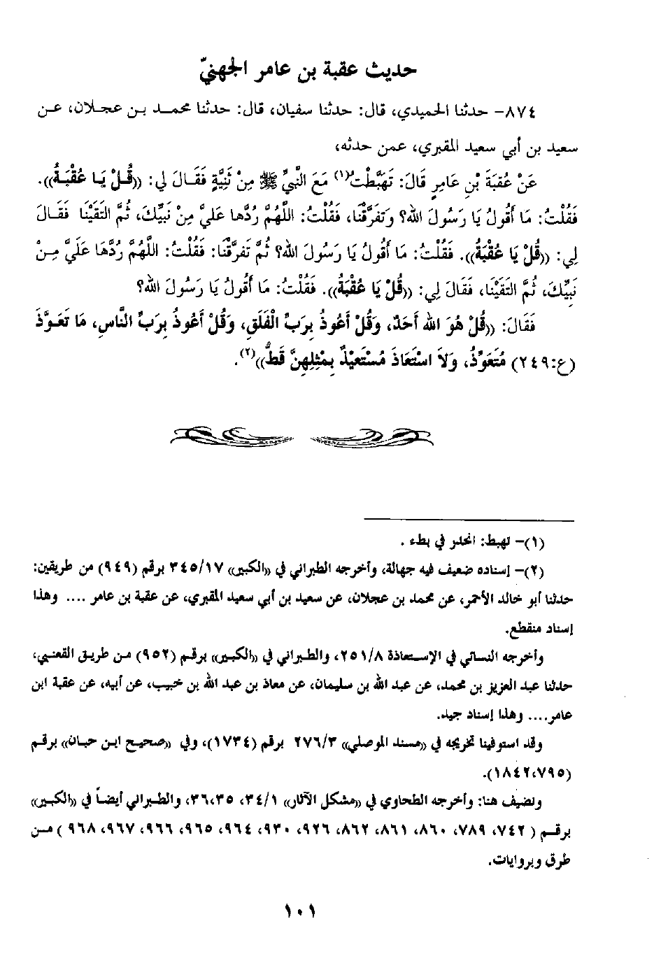 874 - حَدَّثَنَا الْحُمَيْدِيُّ قَالَ: ثنا سُفْيَانُ، قَالَ: ثنا مُحَمَّدُ بْنُ عَجْلَانَ، عَنْ سَعِيدِ بْنِ أَبِي سَعِيدٍ الْمَقْبُرِيِّ، عَمَّنْ حَدَّثَهُ، عَنْ عُقْبَةَ بْنِ عَامِرٍ، قَالَ: تَهَبَّطْتُ مَعَ النَّبِيِّ صَلَّى اللهُ عَلَيْهِ وَسَلَّمَ مِنْ ثَنِيَّةٍ، فَقَالَ لِي: «قُلْ يَا عُقْبَةُ» ، فَقُلْتُ: مَا أَقُولُ يَا رَسُولَ اللَّهِ؟، وَتَفَرَّقَنَا، فَقُلْتُ: اللَّهُمَّ رُدَّهَا عَلَيَّ مِنْ نَبِيِّكَ، ثُمَّ الْتَقَيْنَا، فَقَالَ لِي: «قُلْ يَا عُقْبَةُ» ، فَقُلْتُ: مَا أَقُولُ يَا رَسُولَ اللَّهِ؟ ثُمَّ تَفَرَّقْنَا، فَقُلْتُ: اللَّهُمَّ رُدَّهَا عَلَيَّ مِنْ نَبِيِّكَ، ثُمَّ الْتَقَيْنَا، فَقَالَ لِي: «قُلْ يَا عُقْبَةُ» ، فَقُلْتُ: مَا أَقُولُ يَا رَسُولَ اللَّهِ؟ فَقَالَ: «§قُلْ هُوَ اللَّهُ أَحَدٌ، وَقُلْ أَعُوذُ بِرَبِّ الْفَلَقِ، وَقُلْ أَعُوذُ بِرَبِّ النَّاسِ، مَا تَعَوَّذَ مُتَعَوِّذٌ وَلَا اسْتَعَاذَ مُسْتَعِيذٌ بِمِثْلِهِنَّ قَطُّ»