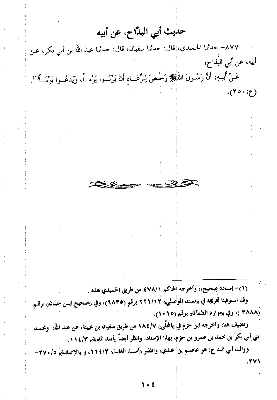 877 - حَدَّثَنَا الْحُمَيْدِيُّ قَالَ: ثنا سُفْيَانُ، قَالَ: ثنا عَبْدُ اللَّهِ بْنُ أَبِي بَكْرٍ، عَنْ أَبِيهِ، عَنْ أَبِي الْبَدَّاحِ، عَنْ أَبِيهِ، «أَنَّ رَسُولَ اللَّهِ صَلَّى اللهُ عَلَيْهِ وَسَلَّمَ §رَخَّصَ لِلرِّعَاءِ أَنْ يَرْمُوا وَيَدْعُوا يَوْمًا»
