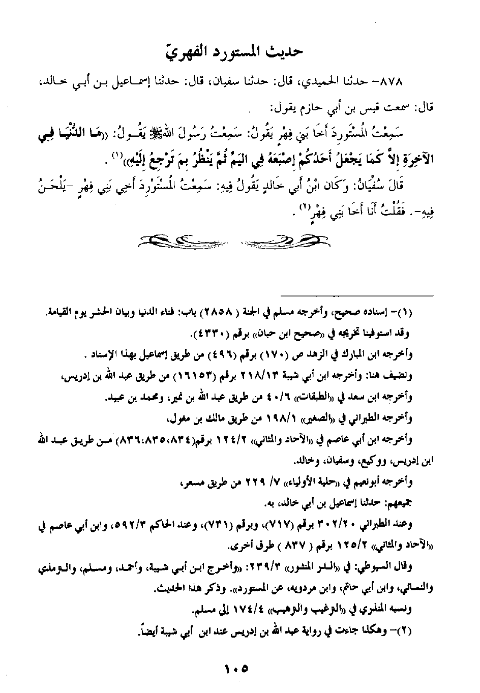 878 - حَدَّثَنَا الْحُمَيْدِيُّ قَالَ: ثنا سُفْيَانُ، قَالَ: ثنا إِسْمَاعِيلُ بْنُ أَبِي خَالِدٍ، قَالَ: سَمِعْتُ قَيْسَ بْنَ أَبِي حَازِمٍ، يَقُولُ: سَمِعْتُ الْمُسْتَوْرِدَ أَخَا بَنِي فِهْرٍ، يَقُولُ سَمِعْتُ رَسُولَ اللَّهِ صَلَّى اللهُ عَلَيْهِ وَسَلَّمَ، يَقُولُ: «§مَا الدُّنْيَا فِي الْآخِرَةِ إِلَّا كَمَا يَجْعَلُ أَحَدُكُمْ إِصْبَعَهُ فِي الْيَمِّ، ثُمَّ يَنْظُرُ بِمَ يَرْجِعُ إِلَيْهِ» ، قَالَ سُفْيَانُ: " وَكَانَ ابْنُ أَبِي خَالِدٍ، يَقُولُ فِيهِ: سَمِعْتُ الْمُسْتَوْرِدَ أَخِي بَنِي فِهْرٍ يَلْحَنُ فِيهِ، فَقُلْتُ أَنَا: أَخَا بَنِي فِهْرٍ "
