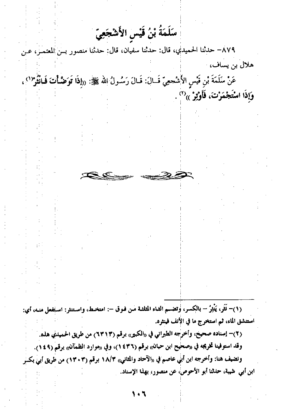 879 - حَدَّثَنَا الْحُمَيْدِيُّ قَالَ: ثنا سُفْيَانُ، قَالَ: ثنا مَنْصُورُ بْنُ الْمُعْتَمِرِ، عَنْ هِلَالِ بْنِ يَسَافٍ، عَنْ سَلِمَةَ بْنِ قَيْسٍ الْأَشْجَعِيِّ، قَالَ: قَالَ رَسُولُ اللَّهِ صَلَّى اللهُ عَلَيْهِ وَسَلَّمَ: «§إِذَا تَوَضَّأْتَ فَانْتَثِرْ، وَإِذَا اسْتَجْمَرْتَ فَأَوْتِرْ»