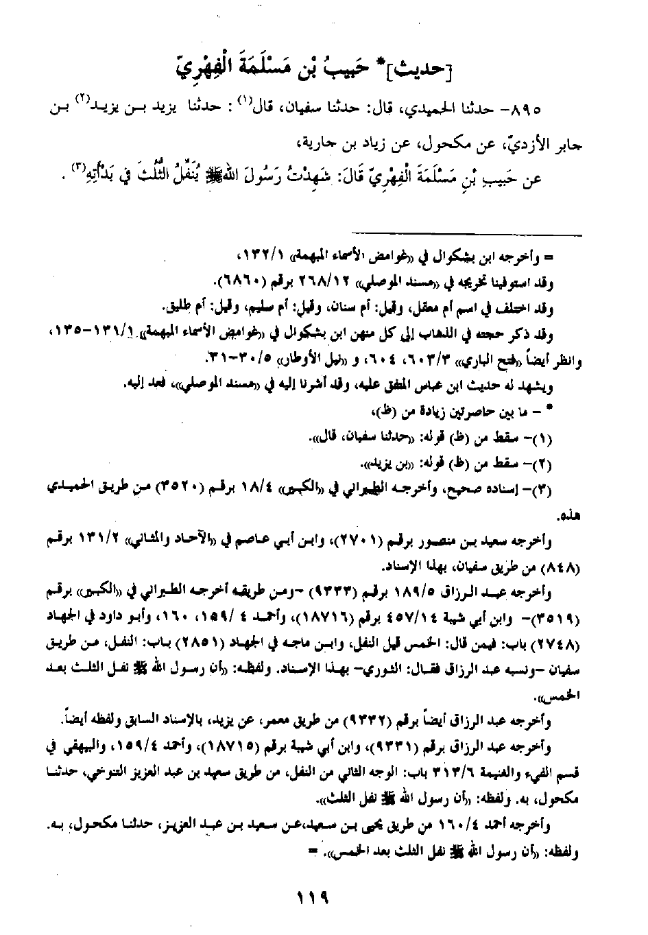 895 - حَدَّثَنَا الْحُمَيْدِيُّ قَالَ: ثنا سُفْيَانُ، قَالَ: ثنا يَزِيدُ بْنُ يَزِيدَ بْنِ جَابِرٍ الْأَزْدِيُّ، عَنْ مَكْحُولٍ، عَنْ زِيَادِ بْنِ جَارِيَةَ، عَنْ حَبِيبِ بْنِ مَسْلَمَةَ الْفِهْرِيِّ، قَالَ: شَهِدْتُ رَسُولَ اللَّهِ صَلَّى اللهُ عَلَيْهِ وَسَلَّمَ «§يَنْفُلُ الثُّلُثَ فِي بَدْئِهِ»