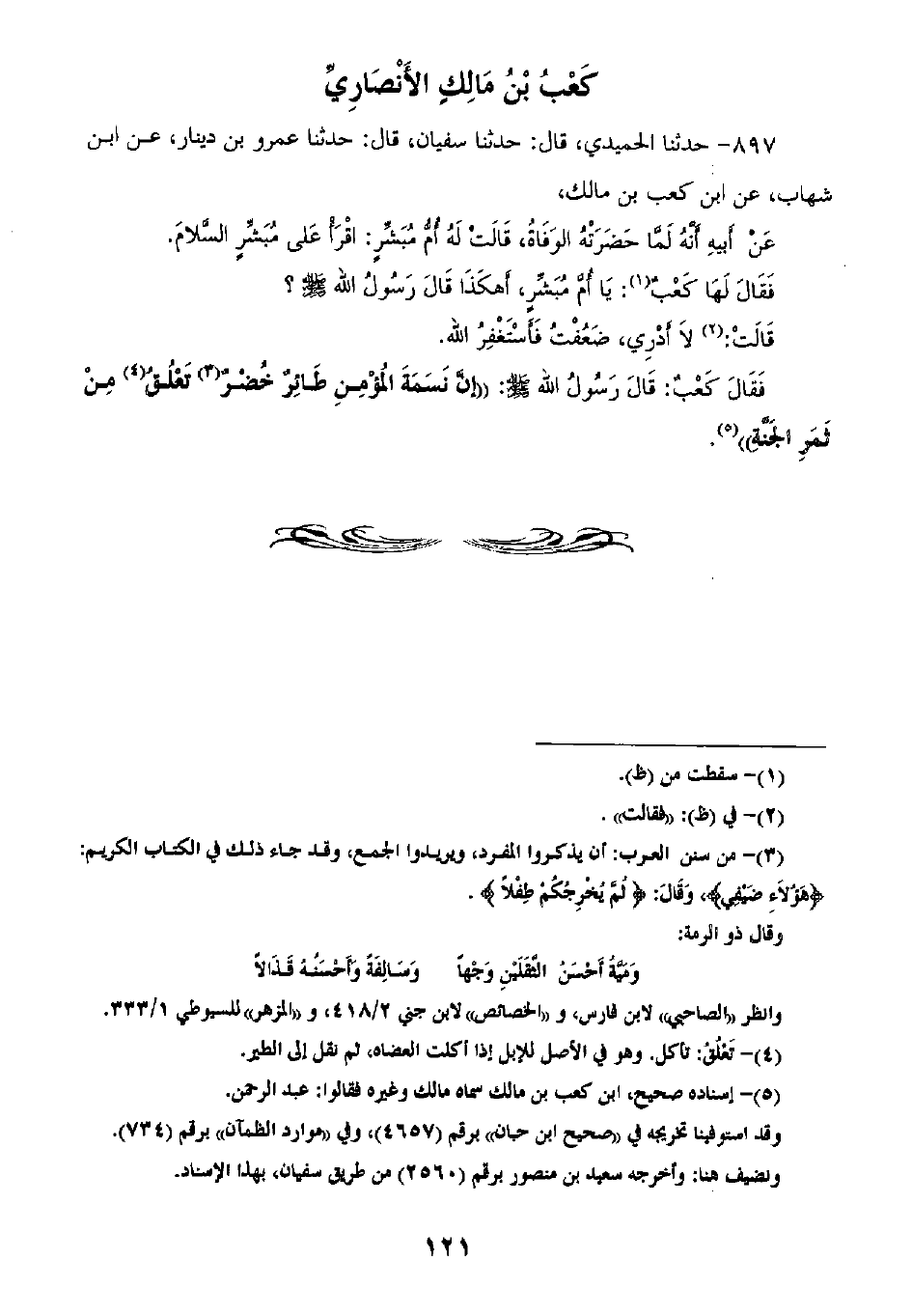 897 - حَدَّثَنَا الْحُمَيْدِيُّ قَالَ: ثنا سُفْيَانُ، قَالَ: ثنا عَمْرُو بْنُ دِينَارٍ، عَنْ ابْنِ شِهَابٍ، عَنْ ابْنِ كَعْبِ بْنِ مَالِكٍ، عَنْ أَبِيهِ، أَنَّهُ لَمَّا حَضَرَتْهُ الْوَفَاةُ، قَالَتْ لَهُ أُمُّ مُبَشِّرٍ: اقْرَأْ عَلَى مُبَشِّرٍ السَّلَامَ، فَقَالَ لَهَا كَعْبٌ: يَا أُمَّ مُبَشِّرٍ، أَهَكَذَا قَالَ رَسُولُ اللَّهِ صَلَّى اللهُ عَلَيْهِ وَسَلَّمَ؟، فَقَالَتْ: لَا أَدْرِي ضَعُفْتُ فَأَسْتَغْفِرُ اللَّهَ، فَقَالَ كَعْبٌ: قَالَ رَسُولُ اللَّهِ صَلَّى اللهُ عَلَيْهِ وَسَلَّمَ: «أَنَّ §نَسَمَةَ الْمُؤْمِنِ طَائِرٌ خَضِرٌ تَعْلَقُ مِنْ ثَمَرِ الْجَنَّةِ»
