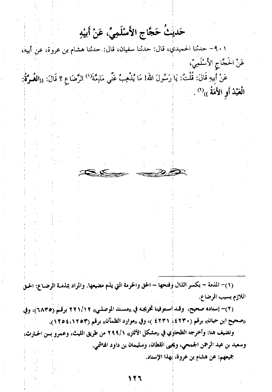 901 - حَدَّثَنَا الْحُمَيْدِيُّ قَالَ: ثنا سُفْيَانُ، قَالَ: ثنا هِشَامُ بْنُ عُرْوَةَ، عَنْ أَبِيهِ، عَنِ الْحَجَّاجِ الْأَسْلَمِيِّ، عَنْ أَبِيهِ، قَالَ: قُلْتُ: يَا رَسُولَ اللَّهِ، §مَا يُذْهِبُ عَنِّي مَذَمَّةَ الرِّضَاعِ؟ قَالَ: «الْغُرَّةُ الْعَبْدُ أَوِ الْأَمَةُ»