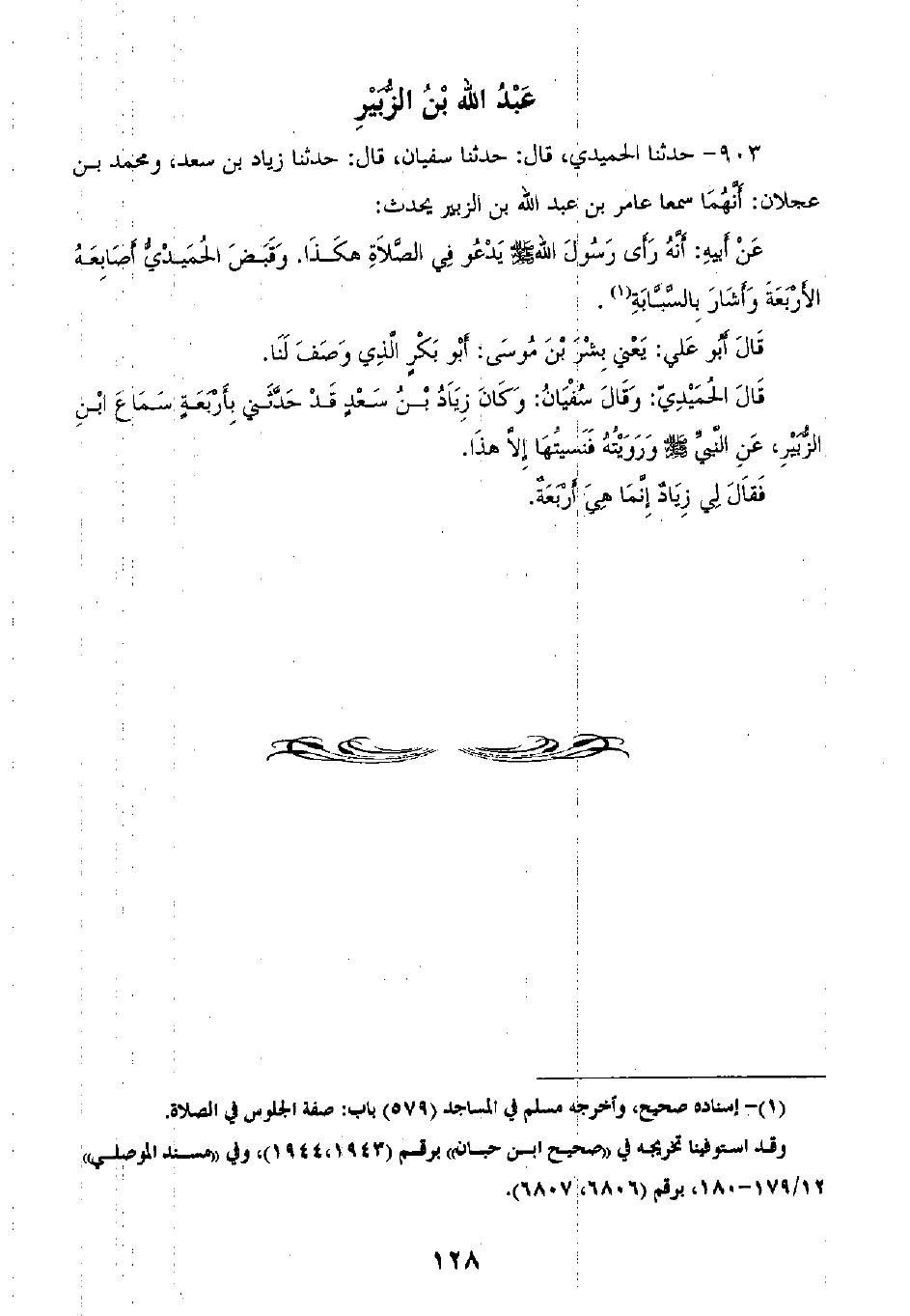 903 - حَدَّثَنَا الْحُمَيْدِيُّ قَالَ: ثنا سُفْيَانُ، قَالَ: ثنا زِيَادُ بْنُ سَعْدٍ، وَمُحَمَّدُ بْنُ عَجْلَانَ، أَنَّهُمَا سَمِعَا عَامِرَ بْنَ عَبْدِ اللَّهِ بْنِ الزُّبَيْرِ يُحَدِّثُ، عَنْ أَبِيهِ، أَنَّهُ «§رَأَى رَسُولَ اللَّهِ صَلَّى اللهُ عَلَيْهِ وَسَلَّمَ يَدْعُو فِي الصَّلَاةِ هَكَذَا» وَقَبَضَ الْحُمَيْدِيُّ أَصَابِعَهُ الْأَرْبَعَةَ وَأَشَارَ بِالسَّبَّابَةِ قَالَ أَبُو عَلِيٍّ يَعْنِي بِشْرَ بْنَ مُوسَى: «أَبُو بَكْرٍ الَّذِي وَصَفَ لَنَا» ، قَالَ الْحُمَيْدِيُّ: وَقَالَ سُفْيَانُ: " وَكَانَ زِيَادُ بْنُ سَعْدٍ قَدْ حَدَّثَنِي بِأَرْبَعَةٍ سَمَاعَ ابْنِ الزُّبَيْرِ، عَنِ النَّبِيِّ صَلَّى اللهُ عَلَيْهِ وَسَلَّمَ وَرَوَيْتُهُ فَنَسِيتُهُ إِلَّا هَذَا، فَقَالَ لِي زِيَادٌ: إِنَّمَا هِيَ أَرْبَعَةٌ "