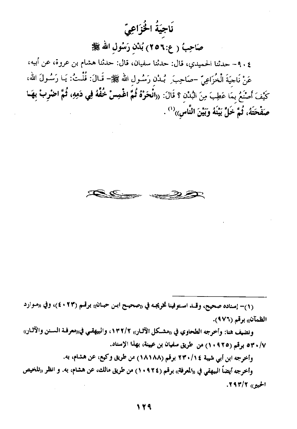 904 - حَدَّثَنَا الْحُمَيْدِيُّ قَالَ: ثنا سُفْيَانُ، قَالَ: ثنا هِشَامُ بْنُ عُرْوَةَ، عَنْ أَبِيهِ، عَنْ نَاجِيَةَ الْخُزَاعِيِّ صَاحِبِ بُدْنِ رَسُولِ اللَّهِ صَلَّى اللهُ عَلَيْهِ وَسَلَّمَ، قَالَ: قُلْتُ: يَا رَسُولَ اللَّهِ §كَيْفَ أَصْنَعُ بِمَا عَطِبَ مِنَ الْبُدْنِ؟ قَالَ: «انْحَرْهُ، ثُمَّ اغْمِسْ خُفَّهُ فِي دَمِهِ، ثُمَّ اضْرِبْ بِهَا صَفْحَتَهُ، ثُمَّ خَلِّ بَيْنَهُ وَبَيْنَ النَّاسِ»