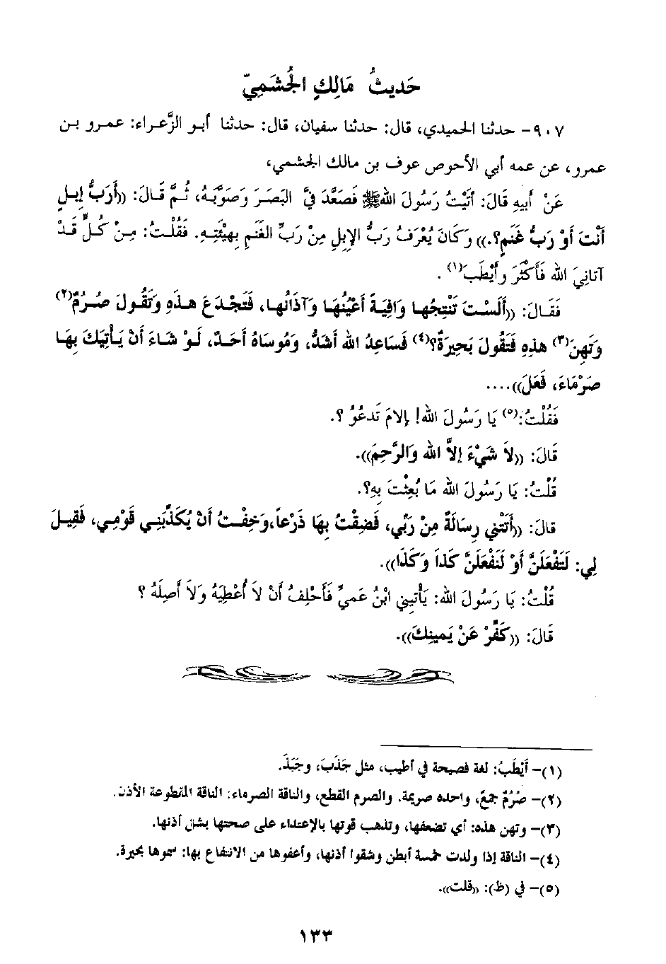 907 - حَدَّثَنَا الْحُمَيْدِيُّ قَالَ: ثنا سُفْيَانُ، قَالَ: ثنا أَبُو الزَّعْرَاءِ عَمْرُو بْنُ عَمْرٍو، عَنْ عَمِّهِ أَبِي الْأَحْوَصِ عَوْفِ بْنِ مَالِكٍ الْجُشْمِيِّ، عَنْ أَبِيهِ، قَالَ: أَتَيْتُ رَسُولَ اللَّهِ صَلَّى اللهُ عَلَيْهِ وَسَلَّمَ فَصَعَّدَ فِيَّ الْبَصَرِ وَصَوَّبَهُ، ثُمَّ قَالَ: «أَرَبُّ إِبِلٍ أَنْتَ، أَوْ رَبُّ غَنَمٍ؟» ، وَكَانَ يُعْرَفُ رَبُّ الْإِبِلِ مِنْ رَبِّ الْغَنَمِ بِهَيْئَتِهِ، فَقُلْتُ: مِنْ كُلٍّ قَدْ أَتَانِيَ اللَّهُ فَأَكْثَرَ، فَقَالَ: «أَلَسْتَ تُنْتِجُهَا وَافِيَهً أَعْيُنُهَا وَآذَانُهَا فَتَجْدَعُ هَذِهِ وَتَقُولُ صُرْمٌ، وَتُهِنُ هَذِهِ فَتَقُولُ بَحِيرَةٌ، وَسَاعِدُ اللَّهِ أَشَدُّ، وَمُوسَاهُ أَحَدُّ، لَوْ شَاءَ أَنْ يَأْتِيَكَ بِهَا صَرْمَاءَ فَعَلَ» ، قُلْتُ: يَا رَسُولَ اللَّهِ §إِلْامَ تَدْعُو؟ قَالَ: «لَا شَيْءَ إِلَّا اللَّهَ وَالرَّحِمَ» ، قُلْتُ: يَا رَسُولَ اللَّهِ، مَا بُعِثْتَ بِهِ؟ قَالَ: " أَتَتْنِي رِسَالَةٌ مِنْ رَبِّي فَضِقْتُ بِهَا ذَرْعًا، وَخِفْتُ أَنْ يُكَذِّبَنِي قَوْمِي، فَقِيلَ لِي: لَتَفْعَلَنَّ أَوْ لَنَفْعَلَنَّ كَذَا، وَكَذَا "، قُلْتُ: يَا رَسُولَ اللَّهِ، يَأْتِينِي ابْنُ عَمِّي، فَأَحْلِفُ أَنْ لَا أُعْطِيَهِ، وَلَا أَصِلَهُ، قَالَ: «كَفِّرْ عَنْ يَمِينِكَ» -[134]-، قَالَ: ثُمَّ قَالَ: «أَرَأَيْتَ لَوْ كَانَ لَكَ عَبْدَانِ أَحَدُهُمَا لَا يَخُونُكَ، وَلَا يَكْتُمُكَ حَدِيثًا، وَلَا يَكْذِبُكَ، وَالْآخَرُ، يَكْذِبُكَ وَيَكْتُمُكَ، وَيْخُونُكَ، أَيُّهُمَا أَحَبُّ إِلَيْكَ» ؟، قُلْتُ: الَّذِي لَا يَكْذِبُنِي، وَلَا يَخُونُنِي، وَلَا يَكْتُمُنِي، قَالَ: فَقَالَ رَسُولُ اللَّهِ صَلَّى اللهُ عَلَيْهِ وَسَلَّمَ: «فَكَذَلِكَ أَنْتُمْ عِنْدَ رَبِّكُمْ»