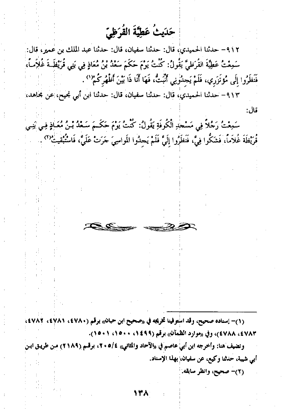 912 - حَدَّثَنَا الْحُمَيْدِيُّ قَالَ: ثنا سُفْيَانُ، قَالَ: ثنا عَبْدُ الْمَلِكِ بْنُ عُمَيْرٍ، قَالَ: سَمِعْتُ عَطِيَّةَ الْقُرَظِيَّ، يَقُولُ: «كُنْتُ يَوْمَ حَكَمَ سَعْدُ بْنُ مُعَاذٍ فِي بَنِي قُرَيْظَةَ غُلَامًا، §فَنَظَرُوا إِلَى مُؤْتَزَرِي، فَلَمْ يَجِدُونِي أَنْبَتُّ، فَهَا أَنَا ذَا بَيْنَ أَظْهُرِكُمْ»