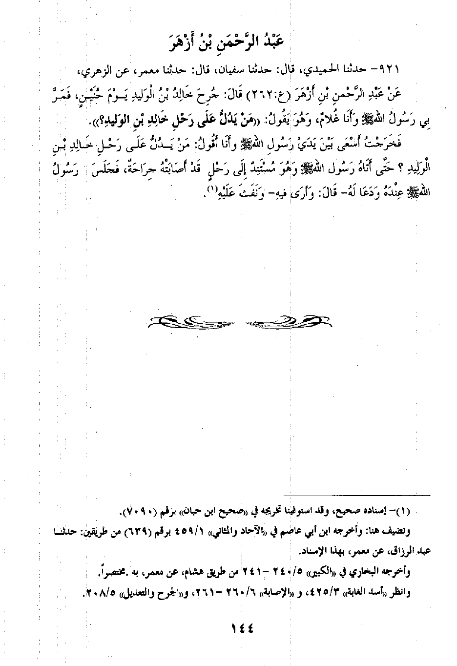 921 - حَدَّثَنَا الْحُمَيْدِيُّ قَالَ: ثنا سُفْيَانُ، قَالَ: ثنا مَعْمَرٌ، عَنِ الزُّهْرِيِّ، عَنْ عَبْدِ الرَّحْمَنِ بْنِ أَزْهَرَ، قَالَ: جُرِحَ خَالِدُ بْنُ الْوَلِيدِ يَوْمَ حُنَيْنٍ، فَمَرَّ بِي رَسُولُ اللَّهِ صَلَّى اللهُ عَلَيْهِ وَسَلَّمَ وَأَنَا غُلَامٌ، وَهُوَ يَقُولُ: «§مَنْ يَدُلُّ عَلَى رَحْلِ خَالِدِ بْنِ الْوَلِيدِ» ، فَخَرَجْتُ أَسْعى بَيْنَ يَدَيْ رَسُولِ اللَّهِ صَلَّى اللهُ عَلَيْهِ وَسَلَّمَ، وَأَنَا أَقُولُ: مَنْ يَدُلُّ عَلَى رَحْلِ خَالِدِ بْنِ الْوَلِيدِ حَتَّى أَتَاهُ رَسُولُ اللَّهِ صَلَّى اللهُ عَلَيْهِ وَسَلَّمَ وَهُوَ مُسْتَنِدٌ إِلَى رَحْلٍ قَدْ أَصَابَتْهُ جِرَاحَةٌ فَجَلَسَ رَسُولُ اللَّهِ صَلَّى اللهُ عَلَيْهِ وَسَلَّمَ عِنْدَهُ وَدَعَا لَهُ، قَالَ: «وَأَرَى فِيهِ وَنَفَثَ عَلَيْهِ»