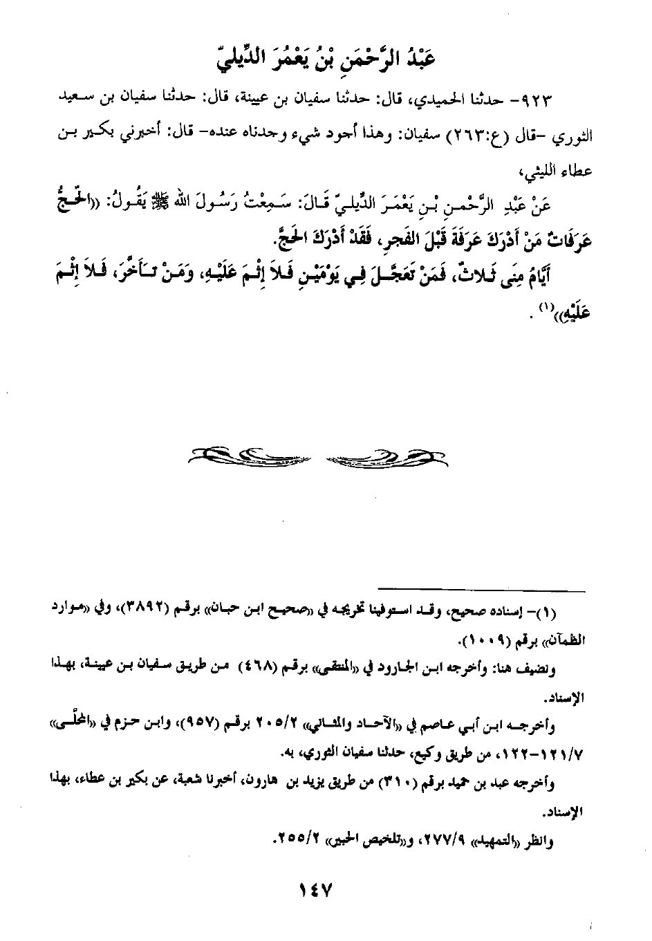 923 - حَدَّثَنَا الْحُمَيْدِيُّ قَالَ: ثنا سُفْيَانُ، قَالَ: ثنا سُفْيَانُ بْنُ سَعِيدٍ الثَّوْرِيُّ، قَالَ سُفْيَانُ: وَهَذَا أَجْوَدُ شَيْءٍ وَجَدْنَاهُ عِنْدَهُ، قَالَ: أَخْبَرَنِي بُكَيْرُ بْنُ عَطَاءٍ اللَّيْثِيُّ، عَنْ عَبْدِ الرَّحْمَنِ بْنِ يَعْمَرَ الدِّيلِيِّ، قَالَ: سَمِعْتُ رَسُولَ اللَّهِ صَلَّى اللهُ عَلَيْهِ وَسَلَّمَ، يَقُولُ: «§الْحَجُّ عَرَفَاتٌ، مَنْ أَدْرَكَ عَرَفَةَ قَبْلَ الْفَجْرِ فَقَدْ أَدْرَكَ الْحَجَّ، أَيَّامُ مِنًى ثَلَاثَةٌ فَمَنْ تَعَجَّلَ فِي يَوْمَيْنِ فَلَا إِثْمَ عَلَيْهِ، وَمَنْ تَأَخَّرَ فَلَا إِثْمَ عَلَيْهِ»