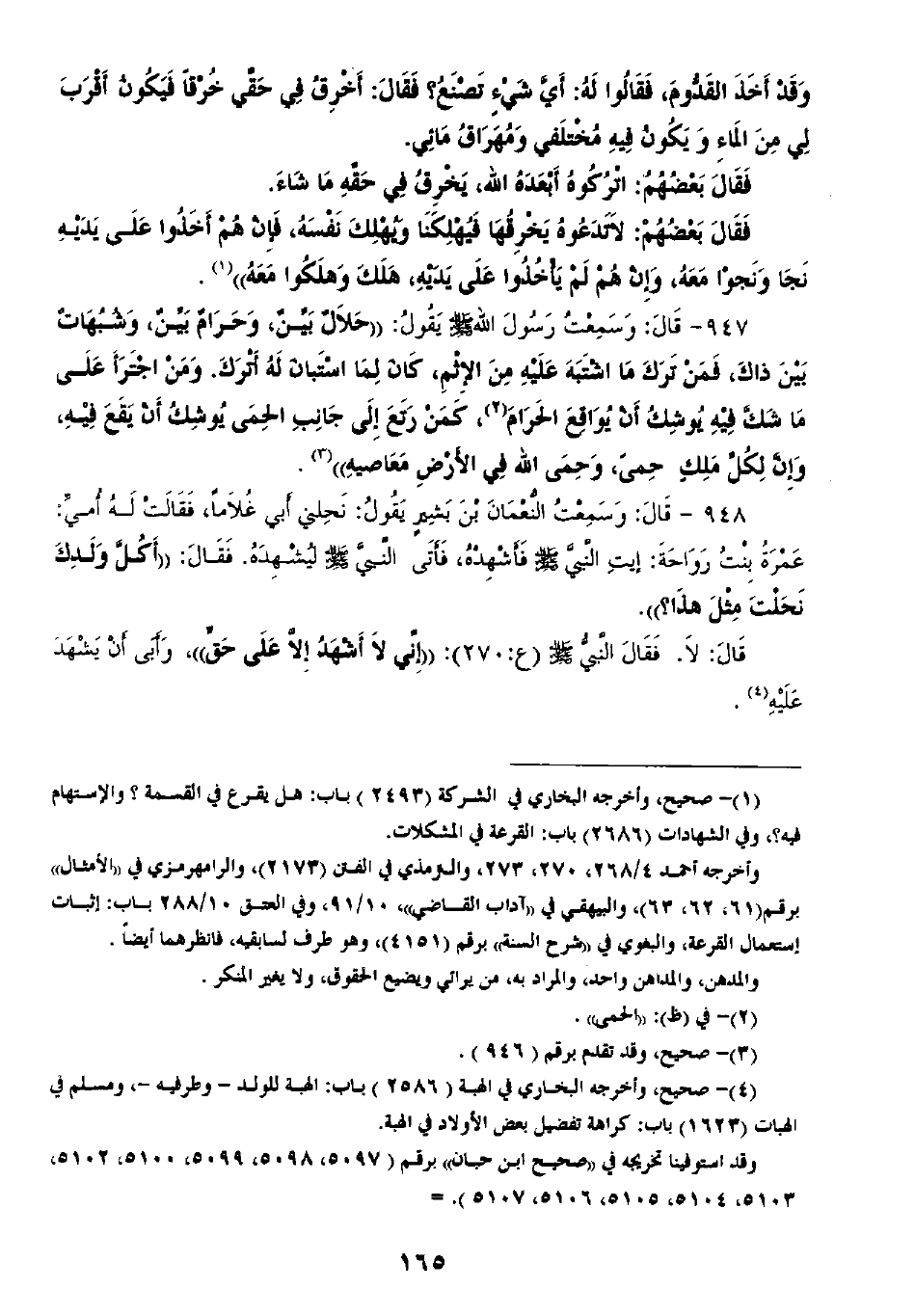 948 - قَالَ: وَسَمِعْتُ النُّعْمَانَ بْنَ بَشِيرٍ، يَقُولُ: نَحَلَنِي أَبِي غُلَامًا، فَقَالَتْ لَهُ أُمِّي عَمْرَةُ بِنْتُ رَوَاحَةَ: إِيتِ النَّبِيَّ صَلَّى اللهُ عَلَيْهِ وَسَلَّمَ فَأَشْهِدْهُ، فَأَتَى النَّبِيَّ صَلَّى اللهُ عَلَيْهِ وَسَلَّمَ لِيُشْهِدَهُ، فَقَالَ: «§أَكَلَ وَلَدِكَ نَحَلْتَ مِثْلَ هَذَا؟» ، قَالَ: لَا، فَقَالَ النَّبِيُّ صَلَّى اللهُ عَلَيْهِ وَسَلَّمَ: «إِنِّي لَا أَشْهَدُ إِلَّا عَلَى حَقٍّ» وَأَبَى أَنْ يَشْهَدَ عَلَيْهِ