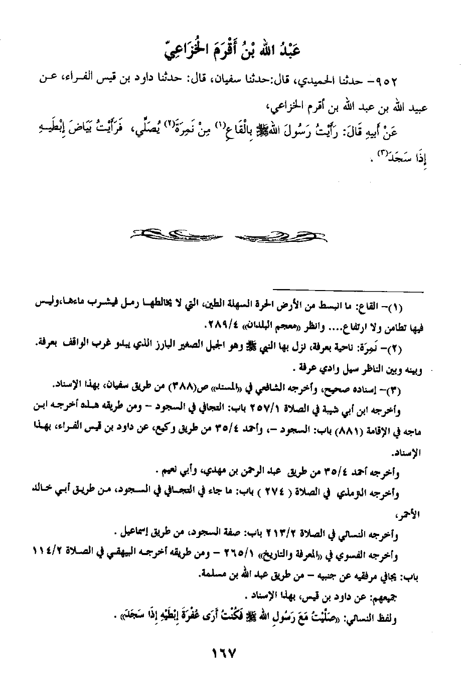 952 - حَدَّثَنَا الْحُمَيْدِيُّ قَالَ: سُفْيَانُ ثنا، قَالَ: ثنا دَاوُدُ بْنُ قَيْسٍ الْفَرَّاءُ، عَنْ عُبَيْدِ اللَّهِ بْنِ عَبْدِ اللَّهِ بْنِ أَقْرَمَ الْخُزَاعِيِّ، عَنْ أَبِيهِ، قَالَ: «رَأَيْتُ رَسُولَ اللَّهِ صَلَّى اللهُ عَلَيْهِ وَسَلَّمَ بِالْقَاعِ مِنْ نَمِرَةَ يُصَلِّي، §فَرَأَيْتُ بَيَاضَ إِبِطَيْهِ إِذَا سَجَدَ»