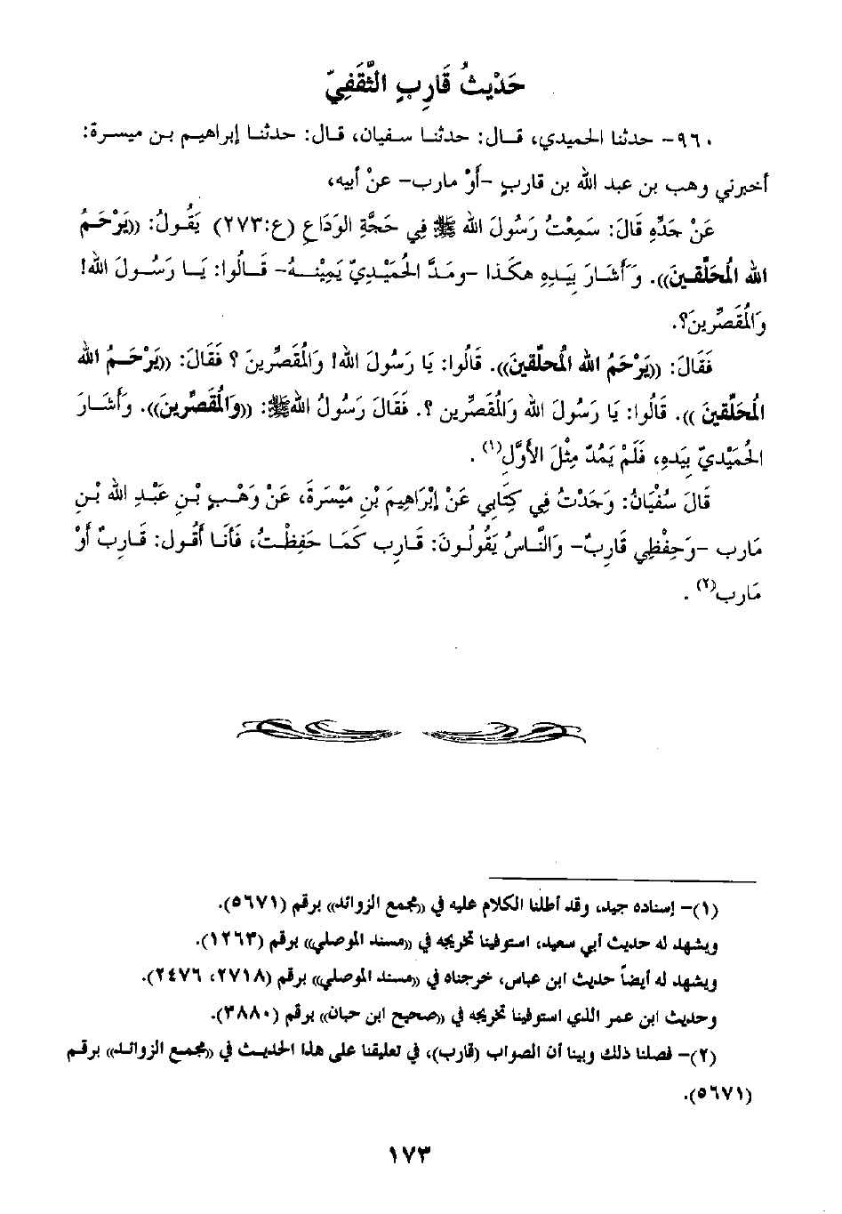 960 - حَدَّثَنَا الْحُمَيْدِيُّ قَالَ: ثنا سُفْيَانُ، قَالَ: ثنا إِبْرَاهِيمُ بْنُ مَيْسَرَةَ، أَخْبَرَنِي وَهْبُ بْنُ عَبْدِ اللَّهِ بْنِ قَارِبٍ، أَوْ مَارِبٍ، عَنْ أَبِيهِ، عَنْ جَدِّهِ، قَالَ: سَمِعْتُ رَسُولَ اللَّهِ صَلَّى اللهُ عَلَيْهِ وَسَلَّمَ فِي حِجَّةِ الْوَدَاعِ، يَقُولُ: «§يُرْحَمُ اللَّهُ الْمُحَلِّقِينَ» وَأَشَارَ بِيَدِهِ هَكَذَا، وَمَدَّ الْحُمَيْدِيُّ يَمِينَهُ، قَالُوا: يَا رَسُولَ اللَّهِ وَالْمُقَصِّرِينَ، فَقَالَ: «يَرْحَمُ اللَّهُ الْمُحَلِّقِينَ» ، قَالُوا: يَا رَسُولَ اللَّهِ وَالْمُقَصِّرِينَ، فَقَالَ: «يَرْحَمُ اللَّهُ الْمُحَلِّقِينَ» ، قَالُوا: يَا رَسُولَ اللَّهِ وَالْمُقَصِّرِينَ، فَقَالَ: «وَالْمُقَصِّرِينَ» وَأَشَارَ الْحُمَيْدِيُّ بِيَدِهِ، فَلَمْ يَمُدَّ مِثْلَ الْأَوَّلِ، قَالَ سُفْيَانُ: " وَجَدْتُ فِي كِتَابِي عَنْ إِبْرَاهِيمَ بْنِ مَيْسَرَةَ، عَنْ وَهْبِ بْنِ عَبْدِ اللَّهِ بْنِ مَارِبٍ -[174]-، وَحِفْظِي قَارِبٍ، وَالنَّاسُ يَقُولُونَ: قَارِبٌ كَمَا حَفِظْتُ، فَأَنَا أَقُولُ: قَارِبٌ، أَوْ مَارِبٌ "