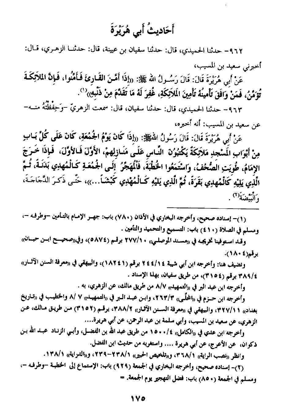 963 - حَدَّثَنَا الْحُمَيْدِيُّ قَالَ: ثنا سُفْيَانُ، قَالَ: سَمِعْتُ الزُّهْرِيَّ وَحَفِظْتُهُ مِنْهُ، عَنْ سَعِيدِ بْنِ الْمُسَيِّبِ أَنَّهُ أَخْبَرَهُ، عَنْ أَبِي هُرَيْرَةَ، قَالَ: قَالَ رَسُولُ اللَّهِ صَلَّى اللهُ عَلَيْهِ وَسَلَّمَ: «§إِذَا كَانَ يَوْمُ الْجُمُعَةِ، كَانَ عَلَى كُلِّ بَابٍ مِنْ أَبْوَابِ الْمَسْجِدِ مَلَائِكَةٌ يَكْتُبُونَ النَّاسَ عَلَى مَنَازِلِهِمْ، الْأَوَّلَ فَالْأَوَّلَ، فَإِذَا خَرَجَ الْإِمَامُ طُوِيَتِ الصُّحُفُ، وَاسْتَمَعُوا الْخُطْبَةَ، فَالْمُهَجِّرُ إِلَى الْجُمُعَةِ كَالْمُهْدِي بَدَنَةً، ثُمَّ الَّذِي يَلِيهِ كَالْمُهْدِي بَقَرَةُ، ثُمَّ الَّذِي يَلِيهِ كَالْمُهْدِي كَبْشًا، حَتَّى ذَكَرَ الدَّجَاجَةَ وَالْبَيْضَةَ» -[176]-، قَالَ أَبُو بَكْرٍ: فَقِيلَ لِسُفْيَانَ: إِنَّهُمْ يَقُولُونَ فِي هَذَا الْحَدِيثِ عَنِ الْأَغَرِّ، عَنْ أَبِي هُرَيْرَةَ، قَالَ سُفْيَانُ: مَا سَمِعْتُ الزُّهْرِيَّ، ذَكَرَ الْأَغَرَّ قَطُّ، مَا سَمِعْتُهُ إِلَّا عَنْ سَعِيدٍ، أَنَّهُ أَخْبَرَهُ عَنْ أَبِي هُرَيْرَةَ