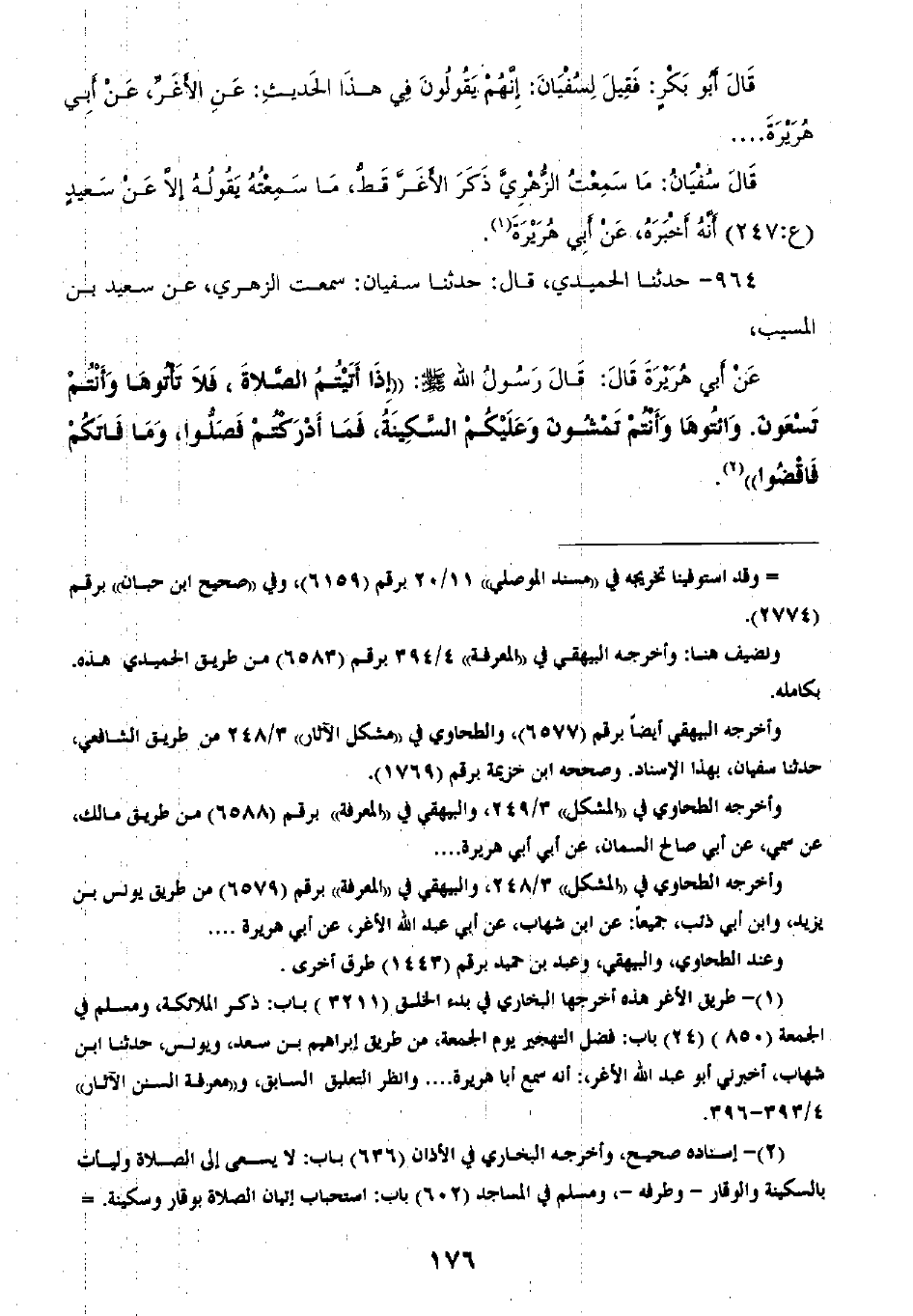 964 - حَدَّثَنَا الْحُمَيْدِيُّ قَالَ: ثنا سُفْيَانُ، سَمِعْتُ الزُّهْرِيَّ، عَنْ سَعِيدِ بْنِ الْمُسَيِّبِ، عَنْ أَبِي هُرَيْرَةَ، قَالَ: قَالَ رَسُولُ اللَّهِ صَلَّى اللهُ عَلَيْهِ وَسَلَّمَ: «§إِذَا أَتَيْتُمُ الصَّلَاةَ فَلَا تَأْتُوهَا وَأَنْتُمْ تَسْعَونَ، وَإِيتُوهَا وَأَنْتُمْ تَمْشُونَ وَعَلَيْكُمُ السَّكِينَةُ، فَمَا أَدْرَكْتُمْ فَصَلُّوا، وَمَا فَاتَكَمْ فَاقْضُوا»