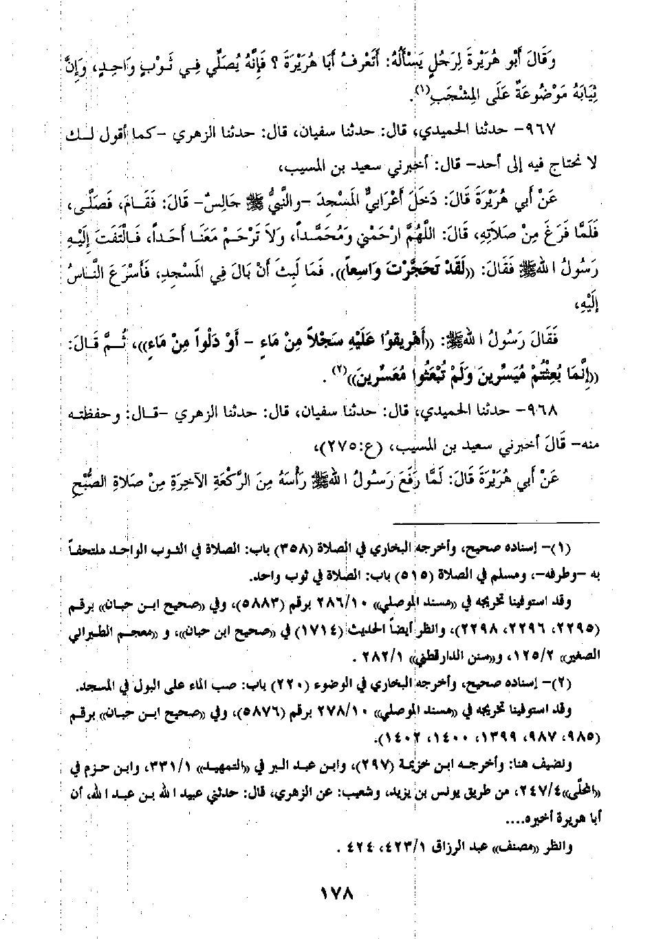 967 - حَدَّثَنَا الْحُمَيْدِيُّ قَالَ: ثنا سُفْيَانُ، قَالَ: ثنا الزُّهْرِيُّ كَمَا أَقُولُ لَكَ لَا نَحْتَاجُ فِيهِ إِلَى أَحَدٍ، قَالَ: أَخْبَرَنِي سَعِيدُ بْنُ الْمُسَيِّبِ، عَنْ أَبِي هُرَيْرَةَ، قَالَ: دَخَلَ أَعْرَابِيٌّ الْمَسْجِدَ، وَالنَّبِيُّ صَلَّى اللهُ عَلَيْهِ وَسَلَّمَ جَالِسٌ، قَالَ: فَقَامَ فَصَلَّى، فَلَمَّا فَرَغَ مِنْ صَلَاتِهِ، قَالَ: اللَّهُمُّ ارْحَمْنِي وَمُحَمَّدًا، وَلَا تَرْحَمْ مَعَنَا أَحَدًا، فَالْتَفَتَ إِلَيْهِ رَسُولُ اللَّهِ صَلَّى اللهُ عَلَيْهِ وَسَلَّمَ، فَقَالَ: «لَقَدْ تَحَجَّرْتَ وَاسِعًا» ، فَمَا لَبِثَ أَنْ بَالَ فِي الْمَسْجِدِ، فَأَسْرَعَ النَّاسُ إِلَيْهِ، فَقَالَ رَسُولُ اللَّهِ صَلَّى اللهُ عَلَيْهِ وَسَلَّمَ: «أَهْرِيقُوا عَلَيْهِ سَجْلًا مِنْ مَاءٍ، أَوْ دَلْوًا مِنْ مَاءٍ» ، ثُمَّ قَالَ: «§إِنَّمَا بُعِثْتُمْ مُيَسِّرِينَ، وَلَمْ تُبْعَثُوا مُعَسِّرِينَ»