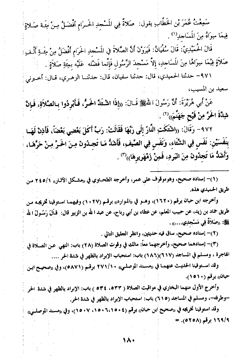 971 - حَدَّثَنَا الْحُمَيْدِيُّ قَالَ: ثنا سُفْيَانُ، قَالَ: ثنا الزُّهْرِيُّ، قَالَ: أَخْبَرَنِي سَعِيدُ بْنُ الْمُسَيِّبِ، عَنْ أَبِي هُرَيْرَةَ، أَنَّ رَسُولَ اللَّهِ صَلَّى اللهُ عَلَيْهِ وَسَلَّمَ، قَالَ: «§إِذَا اشْتَدَّ الْحَرُّ فَأَبْرِدُوا بِالصَّلَاةِ، فَإِنَّ شِدَّةَ الْحَرِّ مِنْ فَيْحِ جَهَنَّمَ» ،