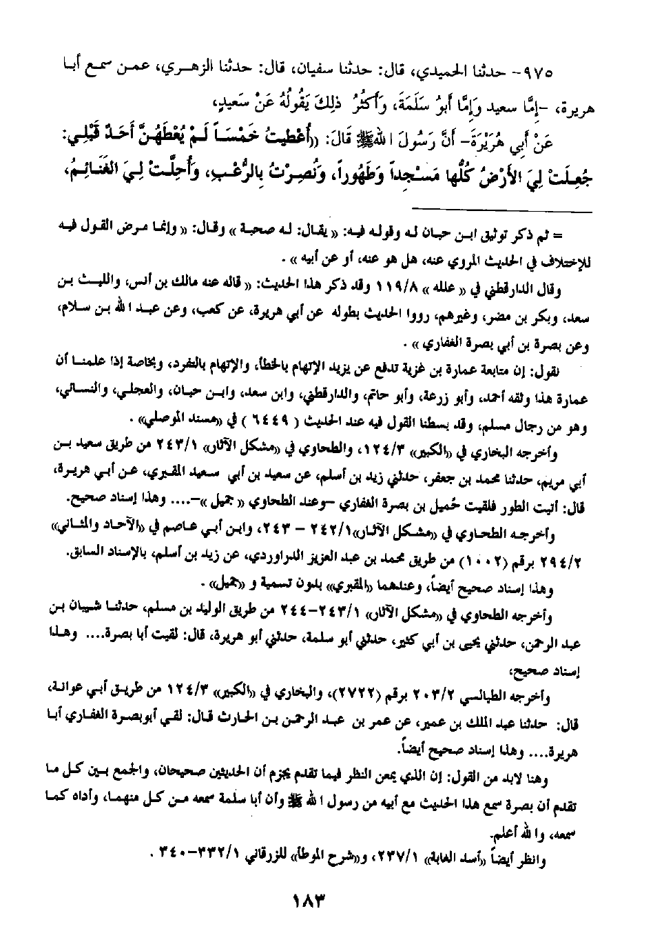 975 - حَدَّثَنَا الْحُمَيْدِيُّ قَالَ: ثنا سُفْيَانُ، قَالَ: ثنا الزُّهْرِيُّ، عَمَّنْ سَمِعَ أَبَا هُرَيْرَةَ، إِمَّا سَعِيدٌ، وَإِمَّا أَبُو سَلَمَةَ، وَأَكْثَرُ ذَلِكَ يَقُولُهُ عَنْ أَبِي هُرَيْرَةَ، أَنَّ رَسُولَ اللَّهِ صَلَّى اللهُ عَلَيْهِ وَسَلَّمَ، قَالَ: " §أُعْطِيتُ خَمْسًا لَمِ يُعْطَهُنَّ أَحَدٌ قَبْلِي: جُعِلَتْ لِيَ الْأَرْضُ كُلُّهَا مَسْجِدًا وَطَهُورًا، وَنُصِرْتُ بِالرُّعْبِ، وَأُحِلَّتْ لِي الْغَنَائِمُ -[184]-، وَأُرْسِلْتُ إِلَى الْأَحْمَرِ وَالْأَسْوَدِ، وَأُعْطِيتُ الشَّفَاعَةَ "