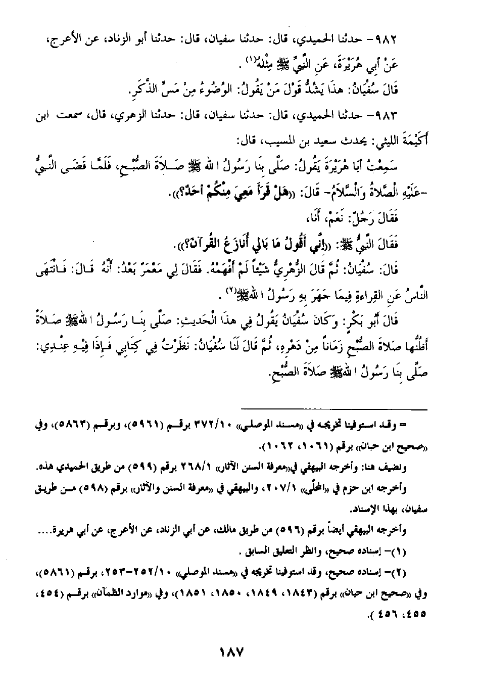 983 - حَدَّثَنَا الْحُمَيْدِيُّ قَالَ: ثنا سُفْيَانُ، قَالَ: ثنا الزُّهْرِيُّ، قَالَ: سَمِعْتُ ابْنَ أُكَيْمَةَ اللَّيْثِيَّ يُحَدِّثُ، سَعِيدَ بْنَ الْمُسَيِّبِ، قَالَ: سَمِعْتُ أَبَا هُرَيْرَةَ، يَقُولُ: صَلَّى بِنَا رَسُولُ اللَّهِ صَلَّى اللهُ عَلَيْهِ وَسَلَّمَ صَلَاةَ الصُّبْحِ، فَلَمَّا قَضَى النَّبِيُّ عَلَيْهِ السَّلَامُ الصَّلَاةَ، قَالَ: «هَلْ قَرَأَ مَعِي مِنْكُمْ أَحَدٌ؟» ، فَقَالَ رَجُلٌ: نَعَمْ أَنَا، فَقَالَ النَّبِيُّ صَلَّى اللهُ عَلَيْهِ وَسَلَّمَ: " إِنِّي أَقُولُ: §مَا بَالِي أُنَازَعُ الْقُرْآنَ؟ " قَالَ سُفْيَانُ: ثُمَّ قَالَ الزُّهْرِيُّ شَيْئًا لَمْ أَفْهَمْهُ، فَقَالَ لِي مَعْمَرٌ بَعْدُ: أَنَّهُ قَالَ: «فَانْتَهَى النَّاسُ عَنِ الْقِرَاءَةِ، فِيمَا جَهَرَ بِهِ رَسُولُ اللَّهِ صَلَّى اللهُ عَلَيْهِ وَسَلَّمَ» ، قَالَ أَبُو بَكْرٍ: وَكَانَ سُفْيَانُ يَقُولُ فِي هَذَا الْحَدِيثِ: «صَلَّى بِنَا رَسُولُ اللَّهِ صَلَّى اللهُ عَلَيْهِ وَسَلَّمَ صَلَاةً أَظُنُّهَا صَلَاةَ الصُّبْحِ زَمَانًا مِنْ دَهْرِهِ» ، ثُمَّ قَالَ لَنَا سُفْيَانُ: نَظَرْتُ فِي كِتَابِي، فَإِذَا فِيهِ عِنْدِي: «صَلَّى بِنَا رَسُولُ اللَّهِ صَلَّى اللهُ عَلَيْهِ وَسَلَّمَ صَلَاةَ الصُّبْحِ»