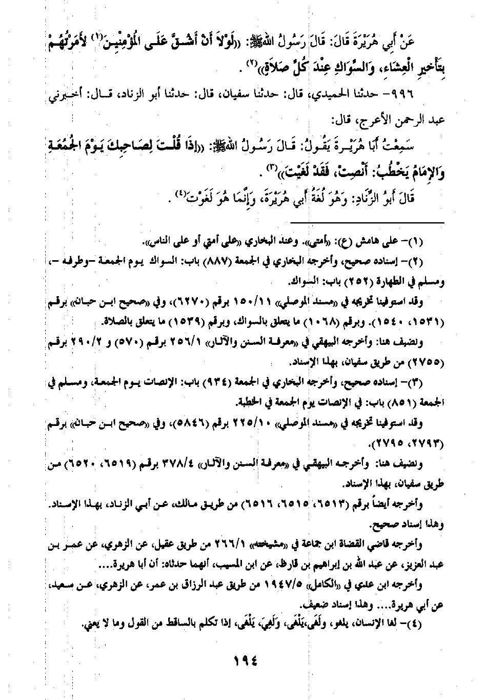 996 - حَدَّثَنَا الْحُمَيْدِيُّ قَالَ: ثنا سُفْيَانُ، قَالَ: ثنا أَبُو الزِّنَادِ، قَالَ: أَخْبَرَنِي عَبْدُ الرَّحْمَنِ الْأَعْرَجُ، قَالَ: سَمِعْتُ أَبَا هُرَيْرَةَ، يَقُولُ: قَالَ رَسُولُ اللَّهِ صَلَّى اللهُ عَلَيْهِ وَسَلَّمَ: «§إِذَا قُلتَ لِصَاحِبِكَ يَوْمَ الْجُمُعَةِ، وَالْإِمَامُ يَخْطُبُ أَنْصِتْ فَقَدْ لَغَيْتَ» ، قَالَ أَبُو الزِّنَادِ: «وَهُوَ لُغَةُ أَبِي هُرَيْرَةَ وَإِنَّمَا هُوَ لَغَوْتَ»