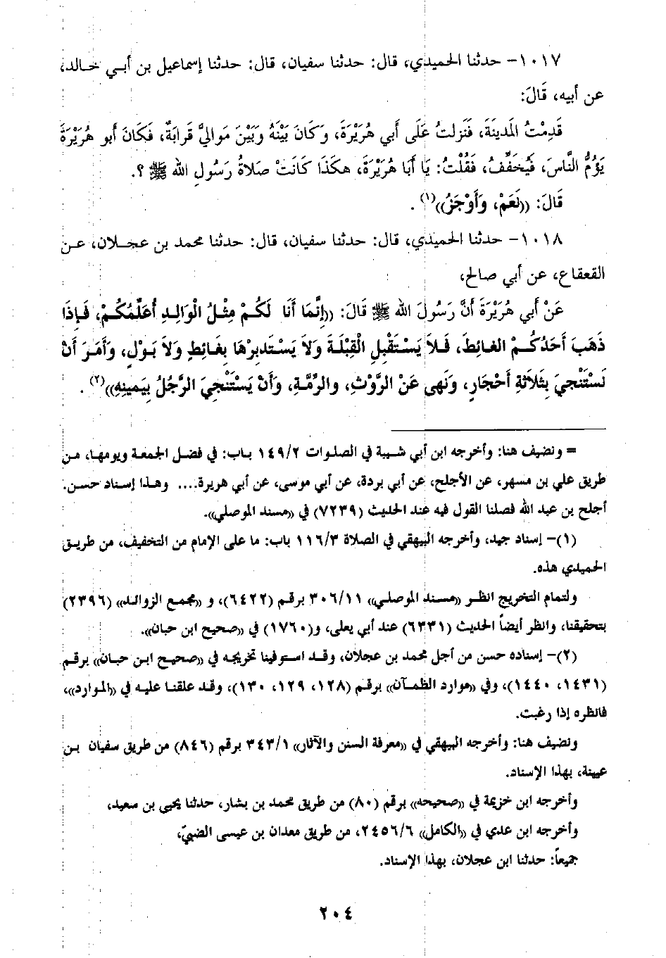 1017 - حَدَّثَنَا الْحُمَيْدِيُّ قَالَ: ثنا سُفْيَانُ، قَالَ: ثنا إِسْمَاعِيلُ بْنُ أَبِي خَالِدٍ، عَنْ أَبِيهِ، قَالَ: قَدِمْتُ الْمَدِينَةَ، فَنَزَلْتُ عَلَى أَبِي هُرَيْرَةَ وَكَانَ بَيْنَهُ وَبَيْنَ مَوَالِيَّ قَرَابَةٌ، فَكَانَ أَبُو هُرَيْرَةَ «§يَؤُمُّ النَّاسَ فَيْخَفِّفُ» ، فَقُلْتُ: يَا أَبَا هُرَيْرَةَ هَكَذَا كَانَتْ صَلَاةُ رَسُولِ اللَّهِ صَلَّى اللهُ عَلَيْهِ وَسَلَّمَ؟ قَالَ: «نَعَمْ، وَأَوْجَزَ»