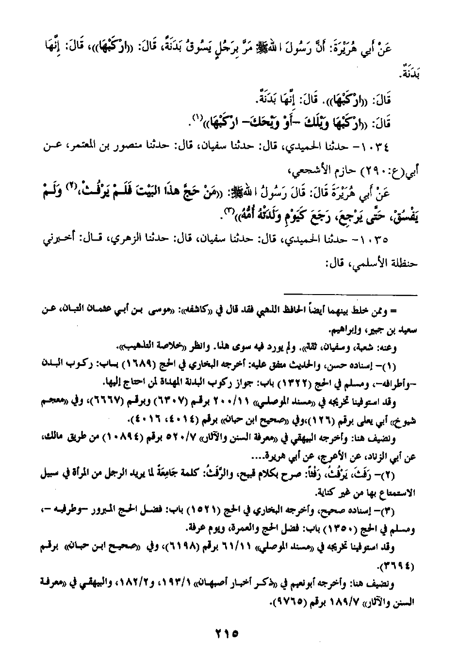 1034 - حَدَّثَنَا الْحُمَيْدِيُّ قَالَ: ثنا سُفْيَانُ، قَالَ: ثنا مَنْصُورُ بْنُ الْمُعْتَمِرِ، عَنْ أَبِي حَازِمٍ الْأَشْجَعِيِّ، عَنْ أَبِي هُرَيْرَةَ، قَالَ: قَالَ رَسُولُ اللَّهِ صَلَّى اللهُ عَلَيْهِ وَسَلَّمَ: «§مَنْ حَجَّ هَذَا الْبَيْتَ فَلَمْ يَرْفُثْ، وَلَمْ يَفْسُقْ حَتَّى يَرْجِعَ، رَجَعَ كَيَوْمِ وَلَدْتُهُ أُمُّهُ»