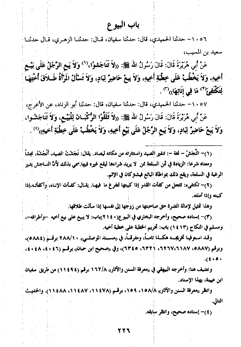 1057 - حَدَّثَنَا الْحُمَيْدِيُّ قَالَ: ثنا سُفْيَانُ، قَالَ: ثنا أَبُو الزِّنَادِ، عَنِ الْأَعْرَجِ، عَنْ أَبِي هُرَيْرَةَ، قَالَ: قَالَ رَسُولُ اللَّهِ صَلَّى اللهُ عَلَيْهِ وَسَلَّمَ: «§لَا تَلَقُّوا الرُّكْبَانَ لِلْبَيْعِ، وَلَا تَنَاجَشُوا، وَلَا يَبِعْ حَاضِرٌ لِبَادٍ، وَلَا يَبِعِ الرَّجُلُ عَلَى بَيْعِ أَخِيهِ، وَلَا يَخْطُبْ عَلَى خِطْبَةِ أَخِيهِ»