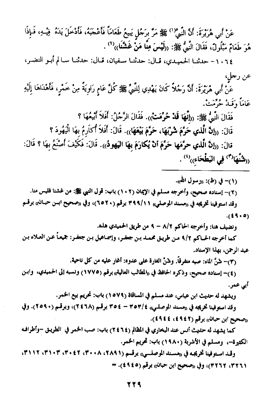 1064 - حَدَّثَنَا الْحُمَيْدِيُّ قَالَ: ثنا سُفْيَانُ، قَالَ: ثنا سَالِمٌ أَبُو النَّضْرِ، عَنْ رَجُلٍ، عَنْ أَبِي هُرَيْرَةَ، أَنَّ رَجُلًا كَانَ يُهْدِي لِلنَّبِيِّ صَلَّى اللهُ عَلَيْهِ وَسَلَّمَ كُلَّ عَامِ رَاوِيَةً مِنْ خَمْرٍ، فَأَهْدَاهَا إِلَيْهِ عَامًا، وَقَدْ حُرِّمَتْ فَقَالَ النَّبِيُّ صَلَّى اللهُ عَلَيْهِ وَسَلَّمَ: «إِنَّهَا قَدْ حُرِّمَتْ» ، فَقَالَ الرَّجُلُ: أَفَلَا أَبِيعُهَا؟ فَقَالَ: «إِنَّ §الَّذِي حَرَّمَ شُرْبَهَا حَرَّمَ بَيْعَهَا» ، قَالَ: أَفَلَا أُكَارِمُ بِهَا الْيَهُودَ؟ قَالَ: «إِنَّ الَّذِي حَرَّمَهَا حَرَّمَ أَنْ يُكَارَمَ بِهَا الْيَهُودُ» ، قَالَ: فَكَيْفَ أَصْنَعُ بِهَا؟، قَالَ: «شُنَّهَا فِي الْبَطْحَاءِ»