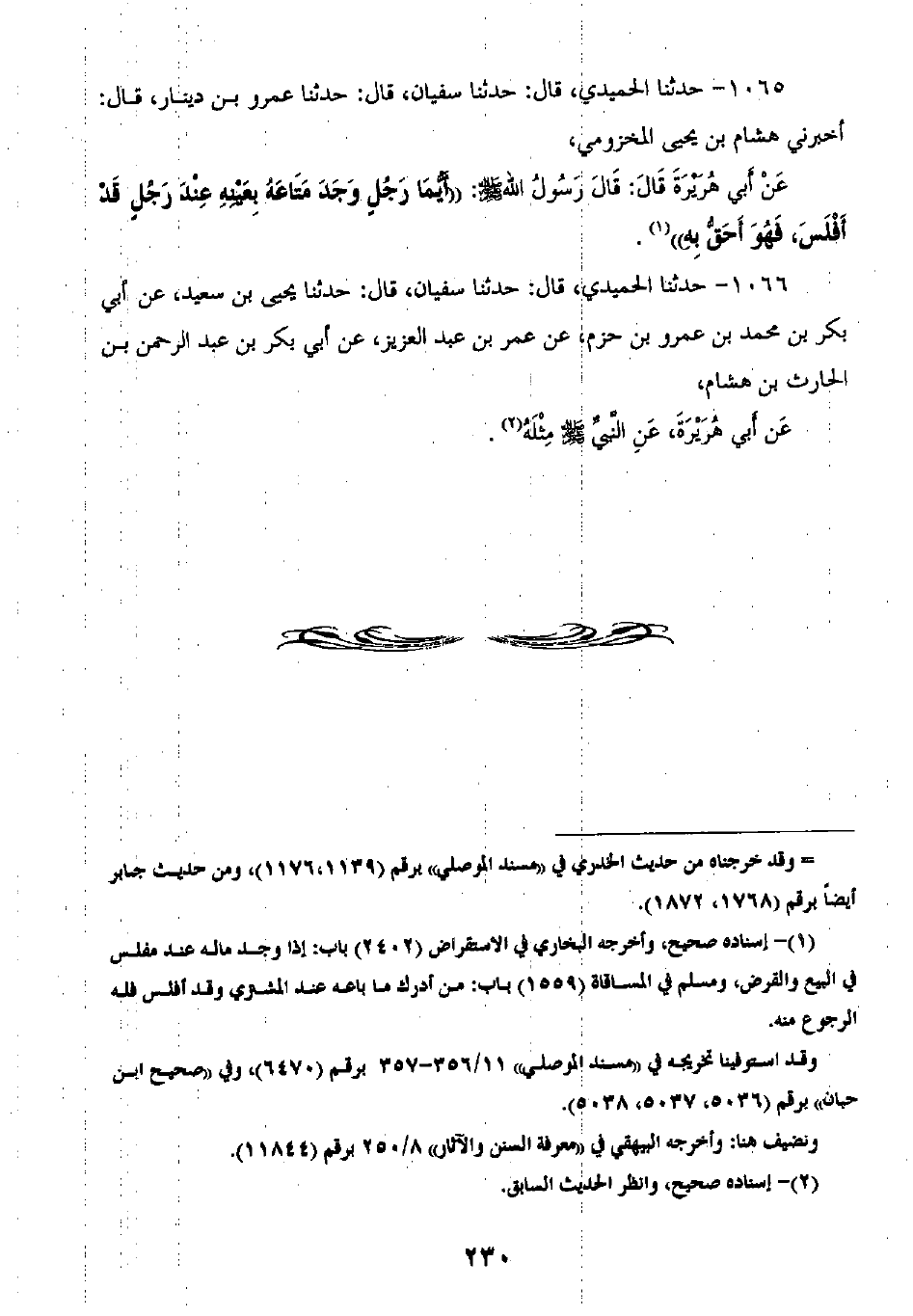 1065 - حَدَّثَنَا الْحُمَيْدِيُّ قَالَ: ثنا سُفْيَانُ، قَالَ: ثنا عَمْرُو بْنُ دِينَارٍ، قَالَ: أَخْبَرَنِي هِشَامُ بْنُ يَحْيَى الْمَخْزُومِيُّ، عَنْ أَبِي هُرَيْرَةَ، قَالَ: قَالَ رَسُولُ اللَّهِ صَلَّى اللهُ عَلَيْهِ وَسَلَّمَ: «§أَيُّمَا رَجُلٍ وَجَدَ مَتَاعَهُ بِعَيْنِهِ عِنْدَ رَجُلٍ قَدْ أَفْلَسَ فَهُوَ أَحَقُّ بِهِ»