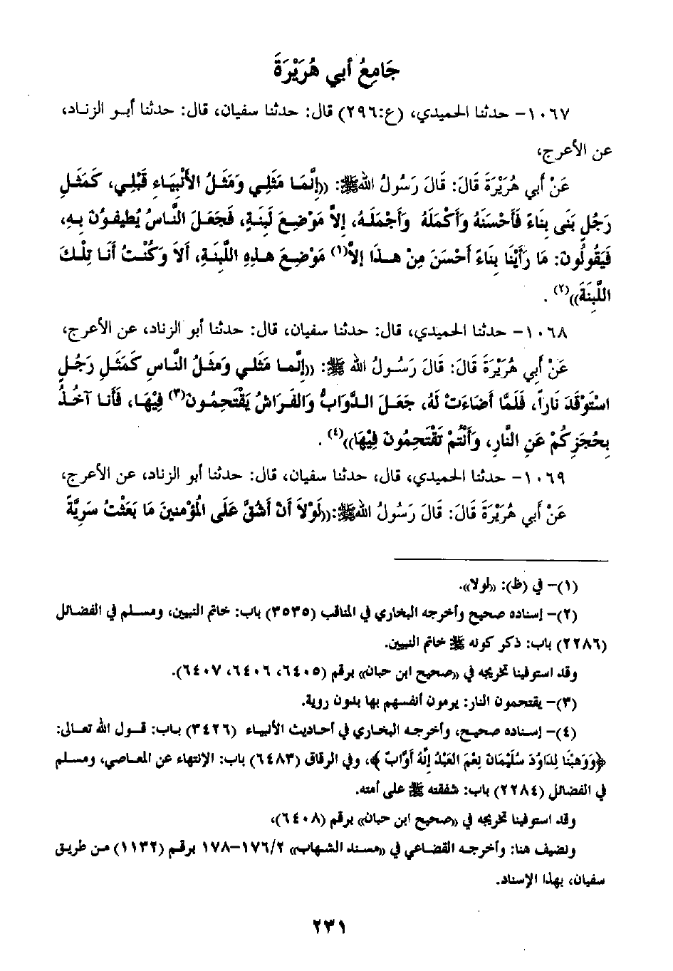 1068 - حَدَّثَنَا الْحُمَيْدِيُّ قَالَ: ثنا سُفْيَانُ، قَالَ: ثنا أَبُو الزِّنَادِ، عَنِ الْأَعْرَجِ، عَنْ أَبِي هُرَيْرَةَ، قَالَ: قَالَ رَسُولُ اللَّهِ صَلَّى اللهُ عَلَيْهِ وَسَلَّمَ: «§إِنَّمَا مَثَلِي وَمَثَلُ النَّاسِ، كَمَثَلِ رَجُلٍ اسْتَوْقَدَ نَارًا، فَلَمَّا أَضَاءَتْ لَهُ، جَعَلَ الدَّوَابُّ وَالْفَرَاشُ يَقْتَحِمُونَ فِيهَا، فَأَنَا آخِذٌ بِحُجُزِكُمْ عَنِ النَّارِ، وَأَنْتُمْ تَقْتَحِمُونَ فِيهَا»