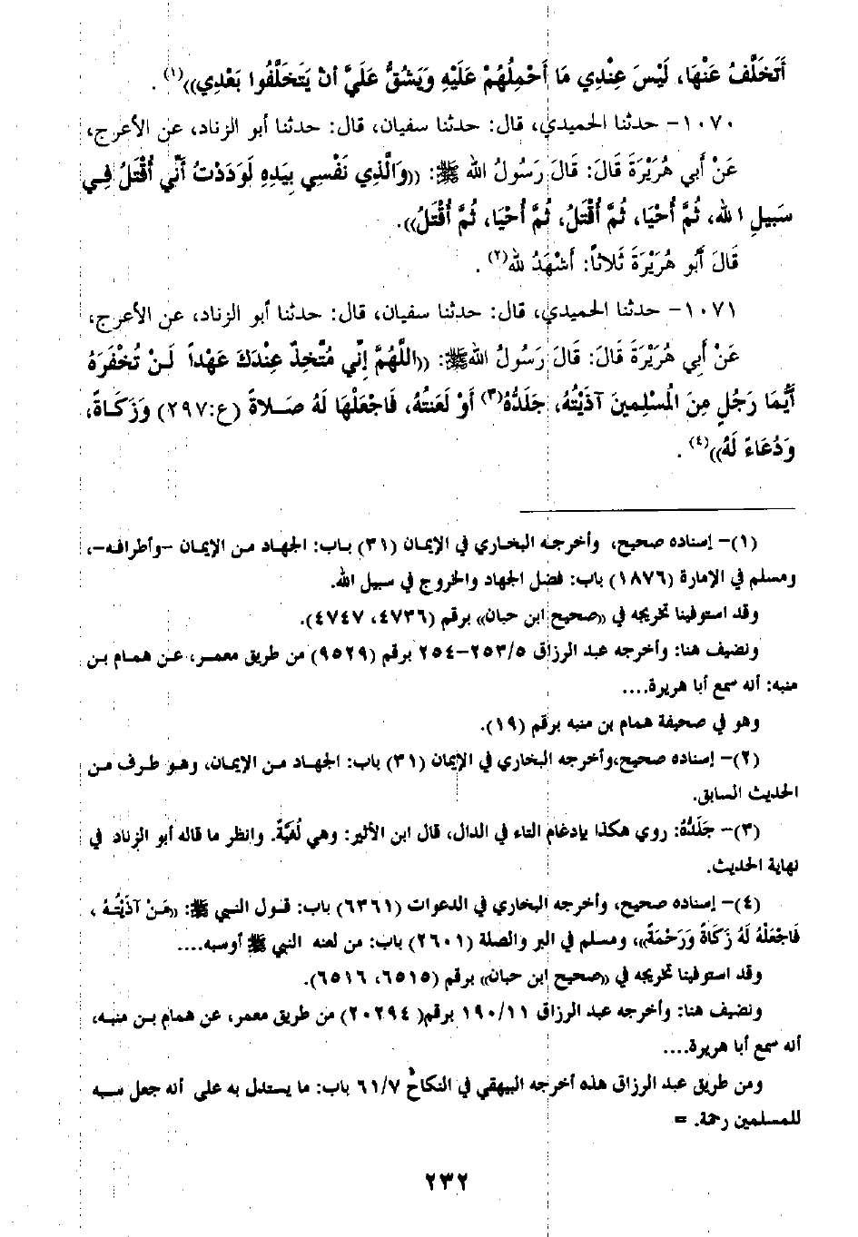1070 - حَدَّثَنَا الْحُمَيْدِيُّ قَالَ: ثنا سُفْيَانُ، قَالَ: ثنا أَبُو الزِّنَادِ، عَنِ الْأَعْرَجِ، عَنْ أَبِي هُرَيْرَةَ، قَالَ: قَالَ رَسُولُ اللَّهِ صَلَّى اللهُ عَلَيْهِ وَسَلَّمَ: «§وَالَّذِي نَفْسِي بِيَدِهِ لَوَدِدْتُ أَنِّي أُقْتَلُ فِي سَبِيلِ اللَّهِ، ثُمَّ أَحْيَا، ثُمَّ أُقْتَلُ، ثُمَّ أَحْيَا، ثُمَّ أُقْتَلُ» ، قَالَ أَبُو هُرَيْرَةَ، ثَلَاثًا: أَشْهَدُ لِلَّهِ