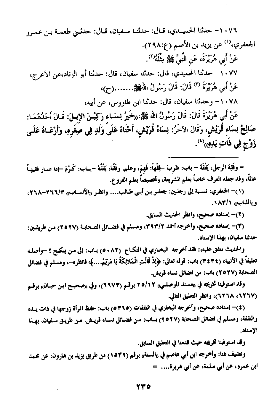 1078 - وَحَدَّثَنَا سُفْيَانُ، قَالَ: ثنا ابْنُ طَاوُسٍ، عَنْ أَبِيهِ، عَنْ أَبِي هُرَيْرَةَ، قَالَ: قَالَ رَسُولُ اللَّهِ صَلَّى اللهُ عَلَيْهِ وَسَلَّمَ: " §خَيْرُ نِسَاءٍ رَكِبْنَ الْإِبِلَ، قَالَ أَحَدُهُمَا: صَالِحُ نِسَاءِ قُرَيْشٍ، وَقَالَ الْآخَرُ: نِسَاءُ قُرَيْشٍ أَحْنَاهُ عَلَى وَلَدٍ فِي صِغَرِهِ وَأَرْعَاهُ عَلَى زَوْجٍ فِي ذَاتِ يَدِهِ "