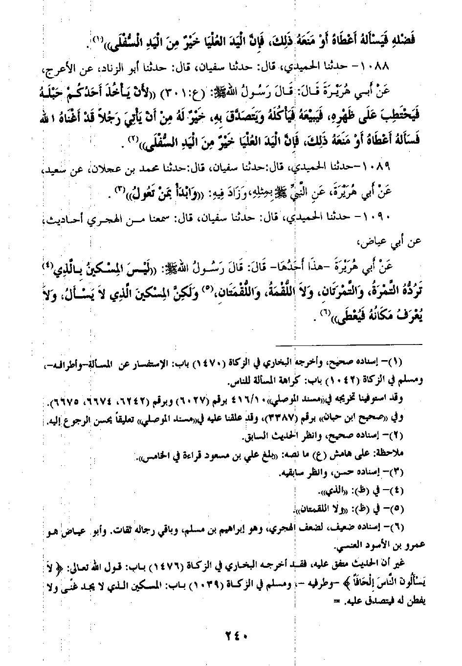 1088 - حَدَّثَنَا الْحُمَيْدِيُّ قَالَ: ثنا سُفْيَانُ، قَالَ: ثنا أَبُو الزِّنَادِ، عَنِ الْأَعْرَجِ، عَنْ أَبِي هُرَيْرَةَ، قَالَ: قَالَ رَسُولُ اللَّهِ صَلَّى اللهُ عَلَيْهِ وَسَلَّمَ: «§لَأَنْ يَأْخُذَ أَحَدُكُمْ حَبْلَهُ، فَيَحْتَطِبَ عَلَى ظَهْرِهِ فَيَبِيعَهُ، فَيَأْكُلَهُ وَيَتَصَدَّقَ بِهِ، خَيْرٌ لَهُ مِنْ أَنْ يَأْتِيَ رَجُلًا قَدْ أَغْنَاهُ اللَّهُ فَسَأَلَهُ أَعْطَاهُ، أَوْ مَنَعَهُ ذَلِكَ، فَإِنَّ الْيَدَ الْعُلْيَا خَيْرٌ مِنَ الْيَدِ السُّفْلَى»