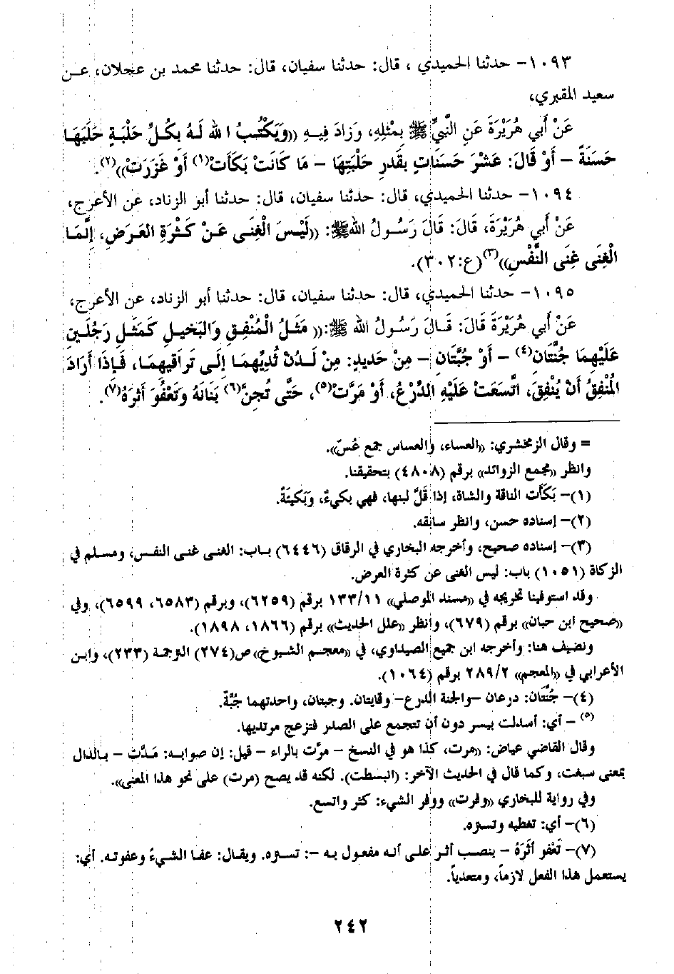 1095 - حَدَّثَنَا الْحُمَيْدِيُّ قَالَ: ثنا سُفْيَانُ، قَالَ: ثنا أَبُو الزِّنَادِ، عَنِ الْأَعْرَجِ، عَنْ أَبِي هُرَيْرَةَ، قَالَ: قَالَ رَسُولُ اللَّهِ صَلَّى اللهُ عَلَيْهِ وَسَلَّمَ: " §مَثَلُ الْمُنْفِقِ وَالْبَخِيلِ كَمَثَلِ رَجُلَيْنِ عَلَيْهِمَا جُنَّتَانِ أَوْ جُبَّتَانِ مِنْ حَدِيدٍ مِنْ لَدُنْ ثُدِّيهِمَا إِلَى تَرَاقِيهِمَا، فَإِذَا أَرَادَ الْمُنْفِقُ أَنْ يُنْفِقَ اتَّسَعَتْ عَلَيْهِ الدِّرْعُ، أَوْ مَرَّتْ حَتَّى تَجِنَّ بَنَانَهُ، وَتَعْفُوَ أَثَرَهُ -[243]-، وَإِذَا أَرَادَ الْبَخِيلُ أَنْ يُنْفِقَ قَلَصَتْ عَلَيْهِ الدِّرْعُ، وَلَزِمَتْ كُلُّ حَلَقَةٍ مَوْضِعَهَا، حَتَّى يَأْخُذَ بِتَرْقُوتِهِ، أَوْ قَالَ: بِرَقَبَتِهِ "، قَالَ أَبُو هُرَيْرَةَ: فَأَشْهَدُ لَرَأَيْتُ رَسُولَ اللَّهِ صَلَّى اللهُ عَلَيْهِ وَسَلَّمَ يَقُولُ بِيَدِهِ هَكَذَا، وَأَشَارَ سُفْيَانُ بِيَدِهِ إِلَى حَلَقَةٍ فَهُوَ يُوَسِّعُهَا وَلَا تَتَّسِعُ، مَرَّتَيْنِ،