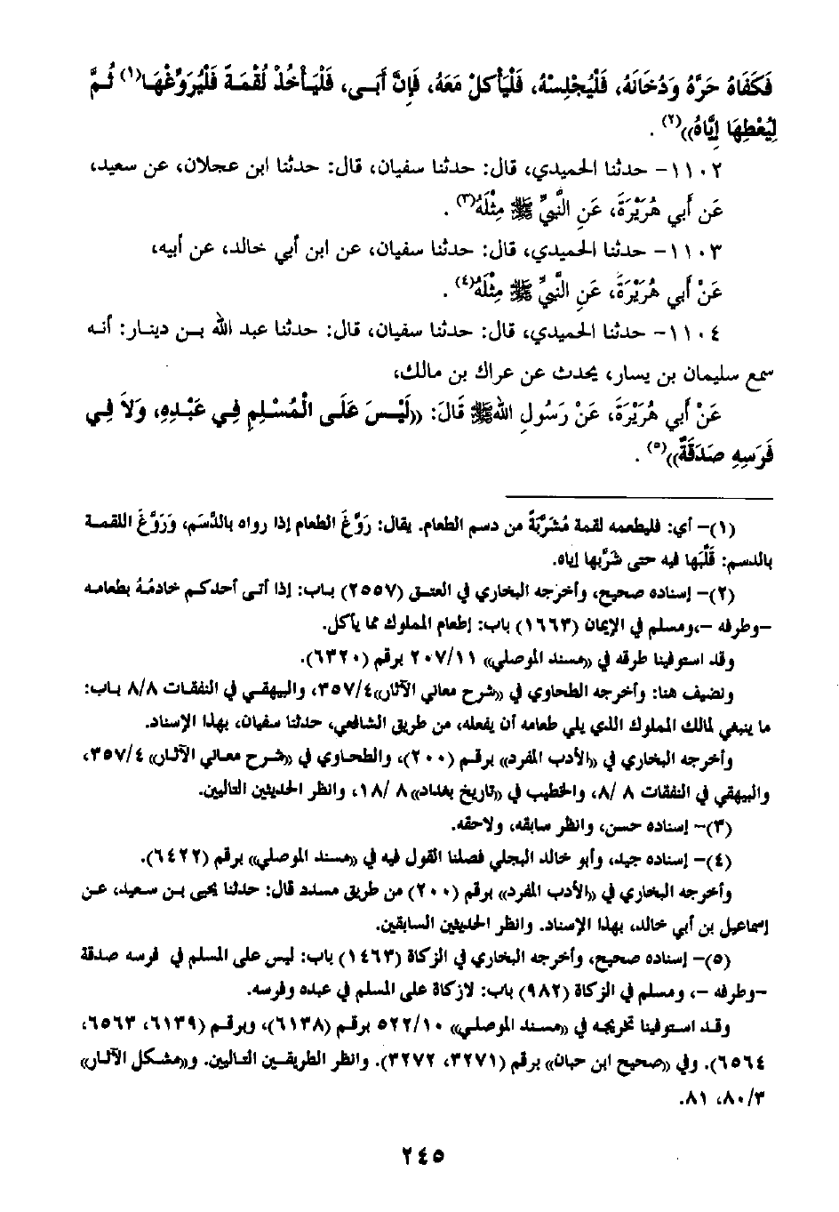1104 - حَدَّثَنَا الْحُمَيْدِيُّ قَالَ: ثنا سُفْيَانُ، قَالَ: ثنا عَبْدُ اللَّهِ بْنُ دِينَارٍ، أَنَّهُ سَمِعَ سُلَيْمَانَ بْنَ يَسَارٍ يُحَدِّثُ، عَنْ عِرَاكِ بْنِ مَالِكٍ، عَنْ أَبِي هُرَيْرَةَ، عَنْ رَسُولِ اللَّهِ صَلَّى اللهُ عَلَيْهِ وَسَلَّمَ، قَالَ: «§لَيْسَ عَلَى الْمُسْلِمِ فِي عَبْدِهِ، وَلَا فِي فَرَسِهِ صَدَقَةٌ» -[246]-.
