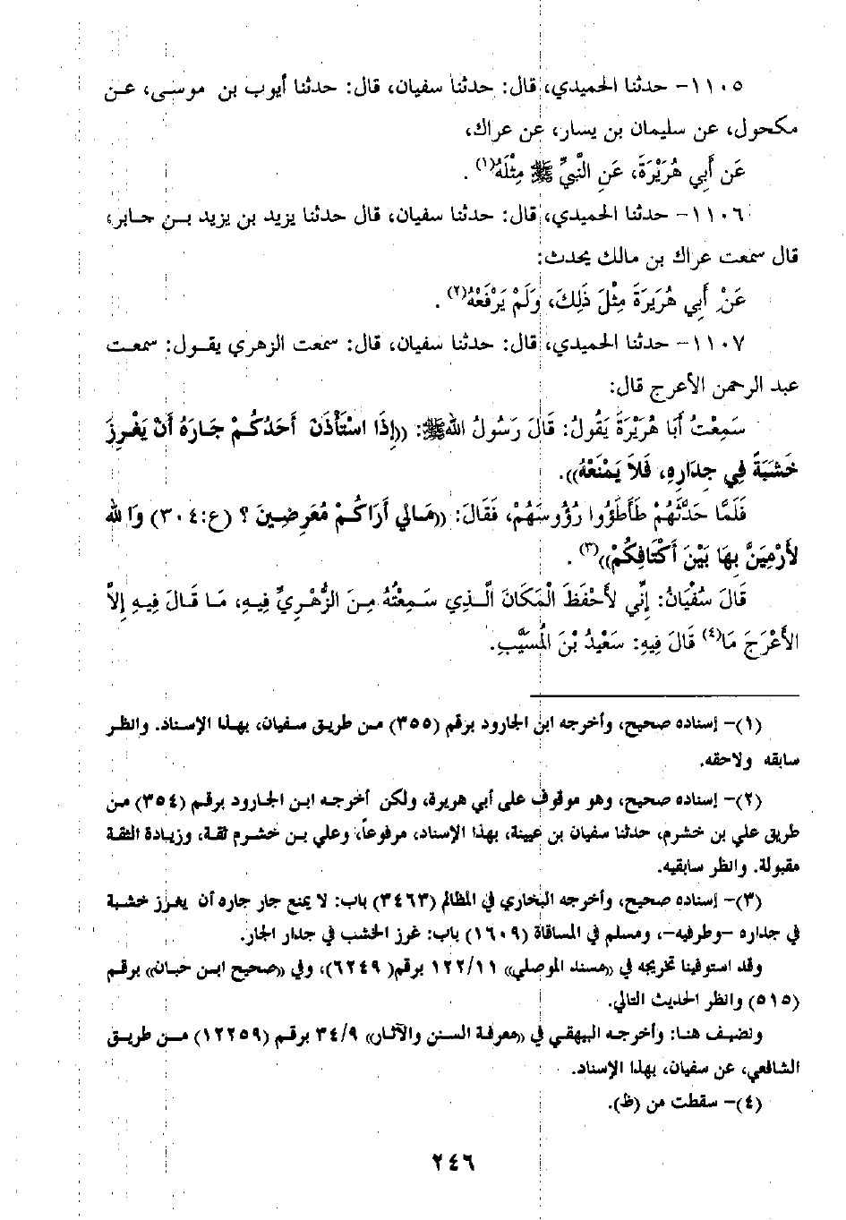 1107 - حَدَّثَنَا الْحُمَيْدِيُّ قَالَ: ثنا سُفْيَانُ، قَالَ: سَمِعْتُ الزُّهْرِيَّ، يَقُولُ: سَمِعْتُ عَبْدَ الرَّحْمَنِ الْأَعْرَجُ، قَالَ: سَمِعْتُ أَبَا هُرَيْرَةَ، يَقُولُ: قَالَ رَسُولُ اللَّهِ صَلَّى اللهُ عَلَيْهِ وَسَلَّمَ: «§إِذَا اسْتَأْذَنَ أَحَدَكُمْ جَارُهُ أَنْ يَغْرِزَ خَشَبَةَ فِي جِدَارِهِ، فَلَا يَمْنَعْهُ» ، فَلَمَّا حَدَّثَهُمْ طَأْطَئُوا رُءُوسَهُمْ، فَقَالَ: «مَا لِي أَرَاكُمْ مُعْرِضِينَ؟ وَاللَّهِ لَأَرْمِيَنَّ بِهَا بَيْنَ أَكْتَافِكُمْ» قَالَ سُفْيَانُ: " إِنِّي لَأَحْفَظُ الْمَكَانَ الَّذِي سَمِعْتُهُ مِنَ الزُّهْرِيِّ فِيهِ، مَا قَالَ فِيهِ إِلَّا الْأَعْرَجُ مَا قَالَ فِيهِ: سَعِيدُ بْنُ الْمُسَيِّبِ "