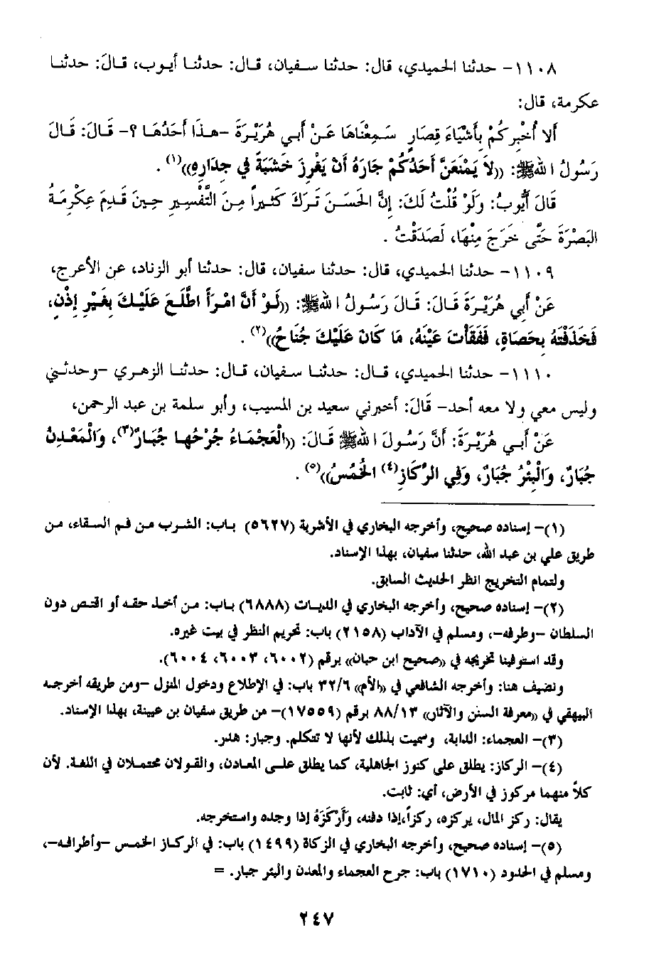 1110 - حَدَّثَنَا الْحُمَيْدِيُّ قَالَ: ثنا سُفْيَانُ، قَالَ: ثنا الزُّهْرِيُّ، وَحَدَّثَنِي وَلَيْسَ مَعِي وَلَا مَعَهُ أَحَدٌ، قَالَ: أَخْبَرَنِي سَعِيدُ بْنُ الْمُسَيِّبِ، وَأَبُو سَلَمَةَ بْنُ عَبْدِ الرَّحْمَنِ، عَنْ أَبِي هُرَيْرَةَ، أَنَّ رَسُولَ اللَّهِ صَلَّى اللهُ عَلَيْهِ وَسَلَّمَ، قَالَ: «§الْعَجْمَاءُ جُرْحُهَا جُبَارٌ، وَالْمَعْدَنُ جُبَارٌ، وَالْبِيَرُ جُبَارٌ، وَفِي الرِّكَازِ الْخُمُسُ» -[248]-