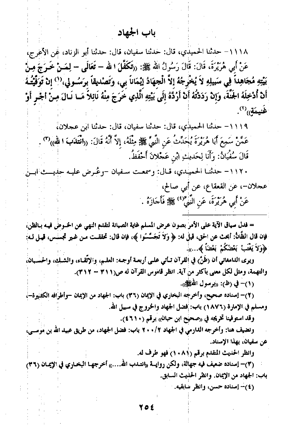 1118 - حَدَّثَنَا الْحُمَيْدِيُّ قَالَ: ثنا سُفْيَانُ، قَالَ: ثنا أَبُو الزِّنَادِ، عَنِ الْأَعْرَجِ، عَنْ أَبِي هُرَيْرَةَ، قَالَ: قَالَ رَسُولُ اللَّهِ صَلَّى اللهُ عَلَيْهِ وَسَلَّمَ: «§تَكَفَّلَ اللَّهُ لِمَنْ خَرَّجَهُ مِنْ بَيْتِهِ مُجَاهِدًا فِي سَبِيلِهِ لَا يُخْرِجُهُ إِلَّا الْجِهَادُ إِيمَانًا بِي، وَتَصْدِيقًا بِرَسُولِي، إِنْ تَوَفَّيْتُهُ، أَنْ أُدْخِلَهُ الْجَنَّةَ، وَإِنْ رَدَدْتُهُ، أَنْ أَرُدَّهُ إِلَى بَيْتِهِ الَّذِي خَرَجَ مِنْهُ نَائِلًا مَا نَالَ مِنْ أَجْرٍ، أَوْ غَنِيمَةٍ» .