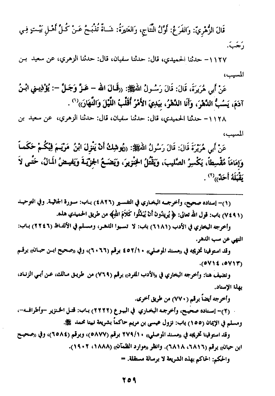 1128 - حَدَّثَنَا الْحُمَيْدِيُّ قَالَ: ثنا سُفْيَانُ، قَالَ: ثنا الزُّهْرِيُّ، عَنْ سَعِيدِ بْنِ الْمُسَيِّبِ، عَنْ أَبِي هُرَيْرَةَ، قَالَ: قَالَ رَسُولُ اللَّهِ صَلَّى اللهُ عَلَيْهِ وَسَلَّمَ: «§يُوشِكُ أَنْ يَنْزِلَ ابْنُ مَرْيَمَ فِيكُمْ حَكَمًا، وَإِمَامًا مُقْسِطًا يَكْسِرُ الصَّلِيبَ، وَيَقْتُلُ الْخِنْزِيرَ، وَيَضَعُ الْجِزْيَةَ، وَيَفِيضُ الْمَالُ حَتَّى لَا يَقْبَلَهُ أَحَدٌ»