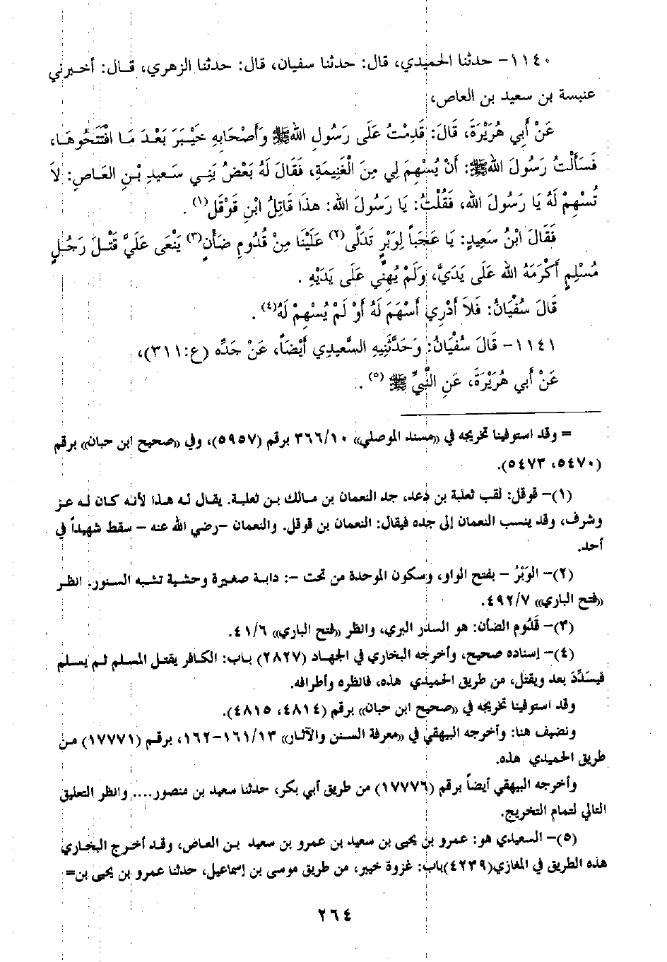 1140 - حَدَّثَنَا الْحُمَيْدِيُّ قَالَ: ثنا سُفْيَانُ، قَالَ: ثنا الزُّهْرِيُّ، قَالَ: أَخْبَرَنِي عَنْبَسَةُ بْنُ سَعِيدِ بْنِ الْعَاصِ، عَنْ أَبِي هُرَيْرَةَ، قَالَ: «§قَدِمْتُ عَلَى رَسُولِ اللَّهِ صَلَّى اللهُ عَلَيْهِ وَسَلَّمَ وَأَصْحَابِهِ خَيْبَرَ بَعْدَمَا افْتَتَحُوهَا، فَسَأَلْتُ رَسُولَ اللَّهِ صَلَّى اللهُ عَلَيْهِ وَسَلَّمَ أَنْ يُسْهِمَ لِي مِنَ الْغَنِيمَةِ» ، فَقَالَ لَهُ بَعْضُ بَنِي سَعِيدِ بْنِ الْعَاصِ: لَا تُسْهِمْ لَهُ يَا رَسُولَ اللَّهِ، فَقُلْتُ: يَا رَسُولَ اللَّهِ، هَذَا قَاتِلُ ابْنِ قَوْقَلٍ، فَقَالَ ابْنُ سَعِيدٍ: يَا عَجَبًا لِوَبْرٍ تَدَّلَى عَلَيْنَا مِنْ قَدُومِ ضَأْنٍ يَنْعَى عَلَى قَتْلِ رَجُلٍ مُسْلِمٍ أَكْرَمَهُ اللَّهُ عَلَى يَدِي، وَلَمْ يُهِنِّي عَلَى يَدَيْهِ، قَالَ سُفْيَانُ: «فَلَا أَدْرَيْ أَسْهَمَ لَهُ أَوْ لَمِ يُسْهِمْ لَهُ» ،