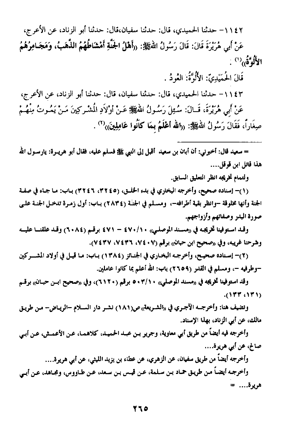 1143 - حَدَّثَنَا الْحُمَيْدِيُّ قَالَ: ثنا سُفْيَانُ، قَالَ: ثنا أَبُو الزِّنَادِ، عَنِ الْأَعْرَجِ، عَنْ أَبِي هُرَيْرَةَ، قَالَ: §سُئِلَ رَسُولُ اللَّهِ صَلَّى اللهُ عَلَيْهِ وَسَلَّمَ عَنْ أَوْلَادِ الْمُشْرِكِينَ، مَنْ يَمُوتُ مِنْهُمْ صِغَارًا، فَقَالَ رَسُولُ اللَّهِ صَلَّى اللهُ عَلَيْهِ وَسَلَّمَ: «اللَّهُ أَعْلَمُ بِمَا كَانُوا عَامِلِينَ»