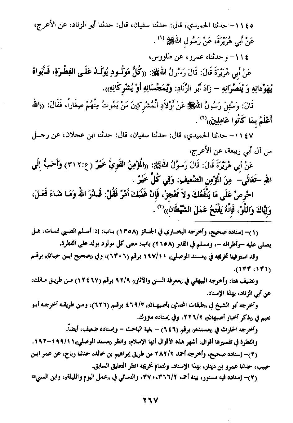 1145 - حَدَّثَنَا الْحُمَيْدِيُّ قَالَ: ثنا سُفْيَانُ، قَالَ: ثنا أَبُو الزِّنَادِ، عَنِ الْأَعْرَجِ، عَنْ أَبِي هُرَيْرَةَ، عَنْ رَسُولِ اللَّهِ صَلَّى اللهُ عَلَيْهِ وَسَلَّمَ،